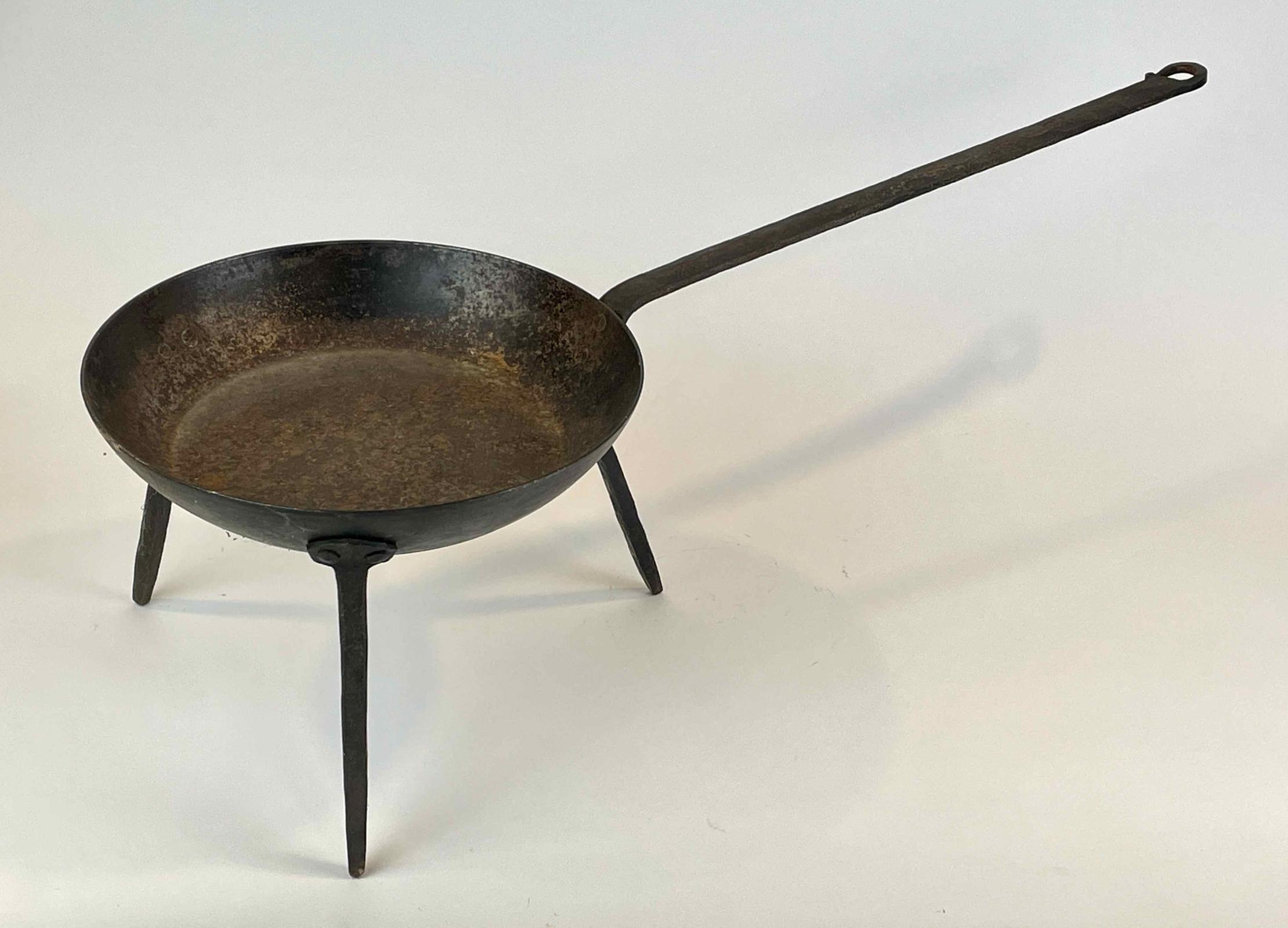 The frying pan stands on three long legs that are attached to the pan sides with two rivets in each. A long handle ends in a narrow tang bent to form a loop. The handle shows little or no evidence of being hammered to flatten it. The thin-walled pan appears to be cast and to have skimming marks on the outside.