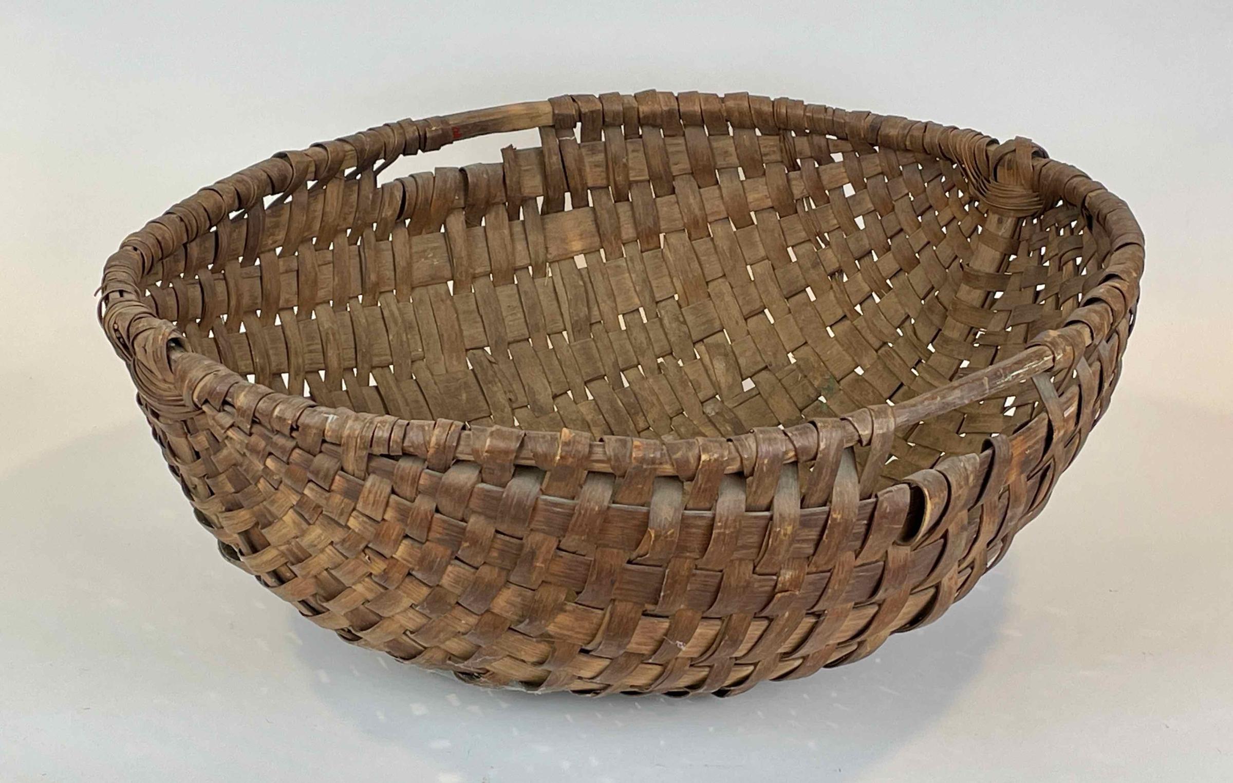 The shallow, oval basket was used for gathering foodstuffs, whether fruits, vegetables, or other. The woven hickory splints have a substantial, rounded hickory hoop around the rim; a second piece forms a spine along the bottom length of the basket. These structural strips are secured in part by wire nails, which help date this basket. Openings at opposite sides at the rim and across the short axis provide convenient handholds.