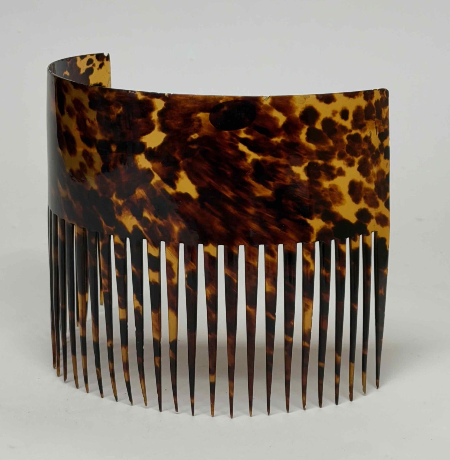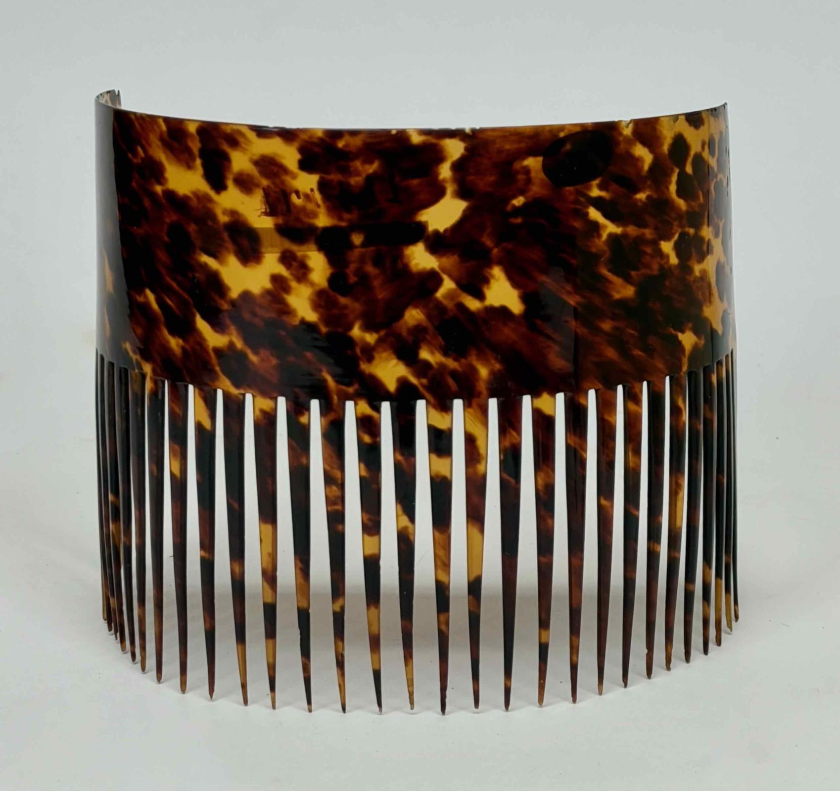 Celluloid, the first thermoplastic, adapted well to creating objects that looked like tortoiseshell, a much more costly material. Celluloid combs became popular from the 1880s on. This one, which may derive from Spanish comb designs, is essential a half-cylinder with 32 teeth cut into one side.
