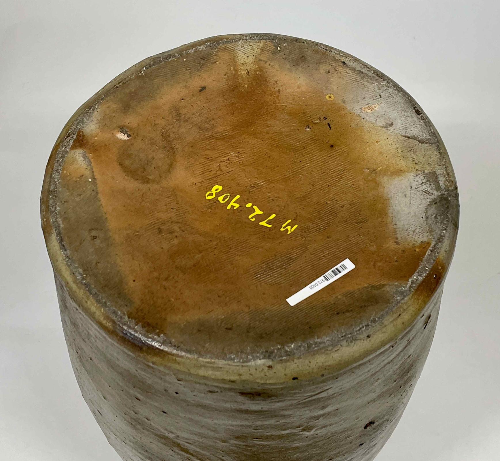 This jar likely functioned well for pickling and otherwise storing food. Its sharply out-flaring rim allows a cover to be tied on securely, perhaps after inserting a wood lid of some kind. As for aesthetics, the jar is less successful. Its shape is generally cylindrical, but it is uneven. The surface as all sorts of discoloration and accretions, likely due to extraneous materials in the kiln when the pot was fired. Given all of the eccentricities exhibited, this jar likely didn't travel very far from its place of origin.