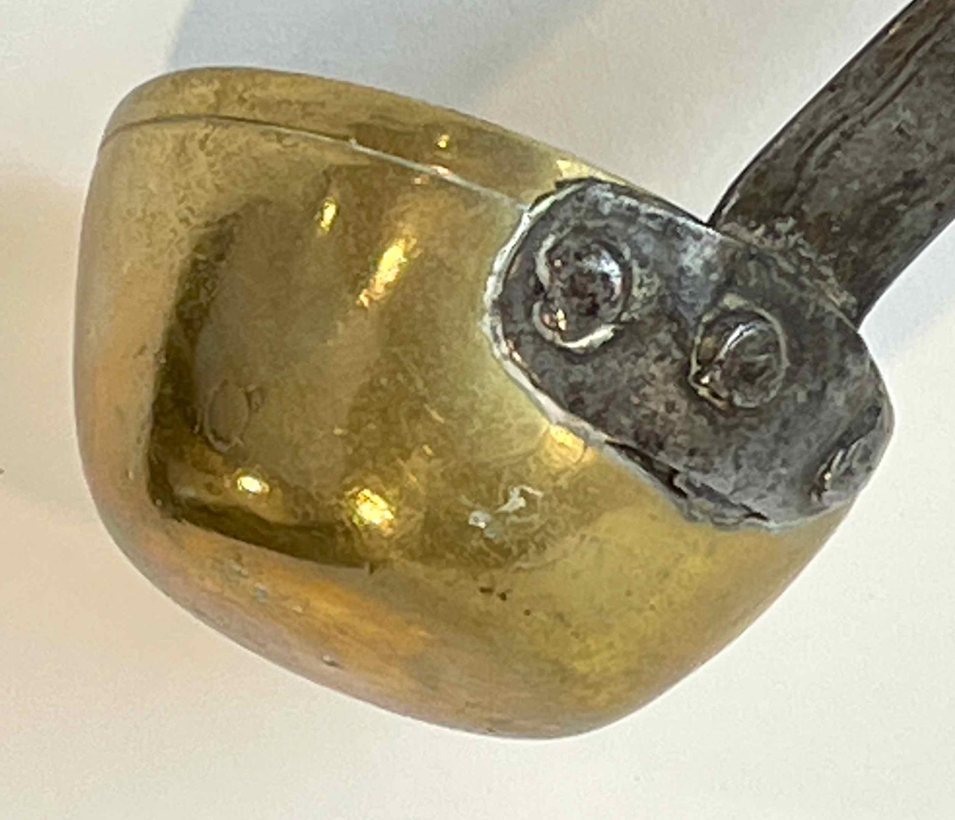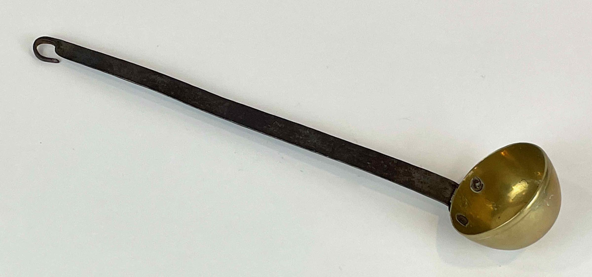 The small ladle has a relatively heavy bowl with a shallow lip at the rim. It attaches to a wrought-iron handle with two iron rivets that pass through a short strap attached to the handle end by a third rivet. The flattened handle ends in a curved tang that serves as a hook.