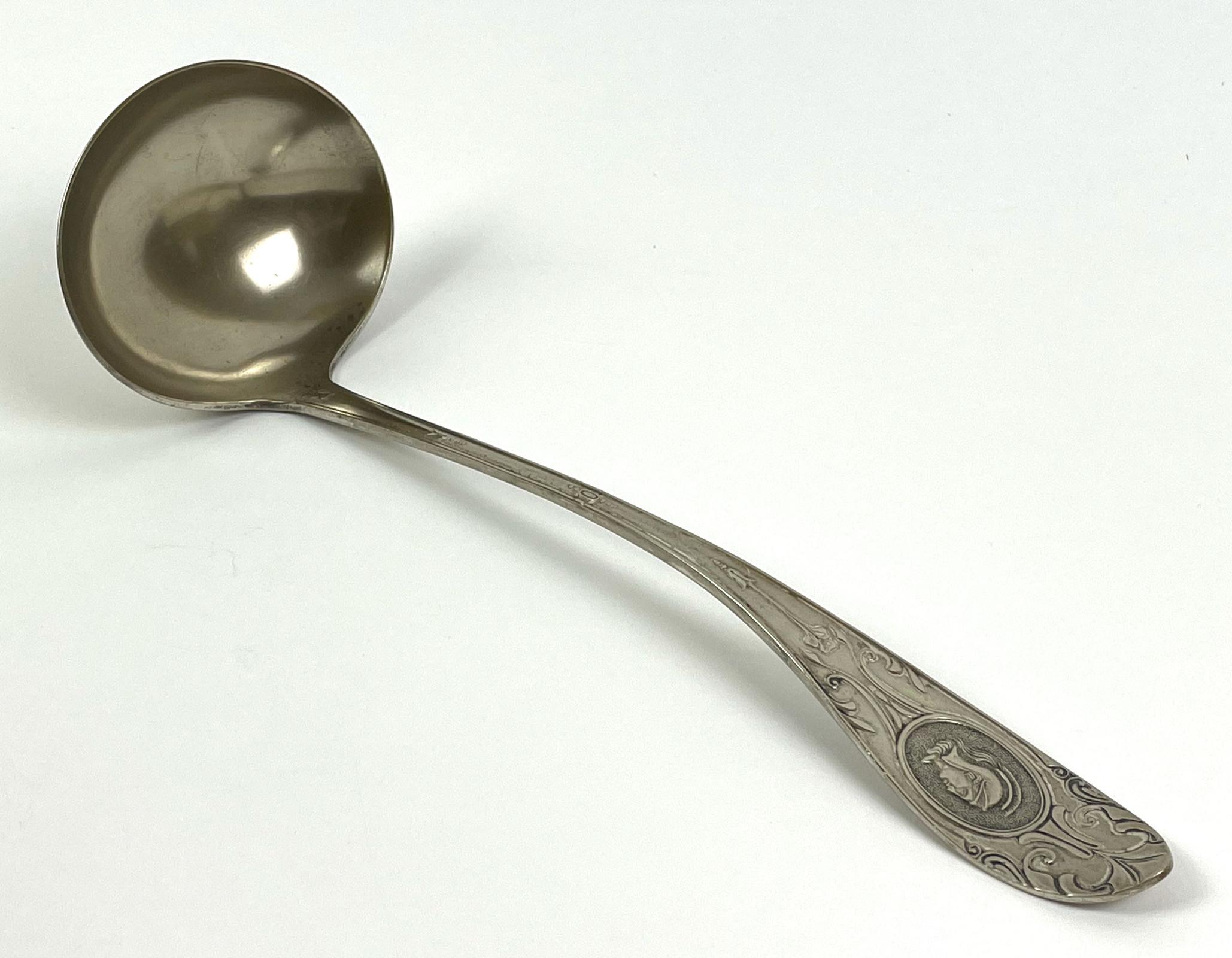 The ladle is made of an alloy of copper, nickel, and zinc, as reported in a quantitative X ray fluorescence test conducted at Winterthur and reported on May 30, 2001. This particular alloy is popularly known as German silver. The ladle has stamped decoration in the handle showing the side profile of a Roman warrior within an oval amid simple floral fines and leaves. The Bowman name stamped into the back of the shaft is not identified. It may be that of a retailer.