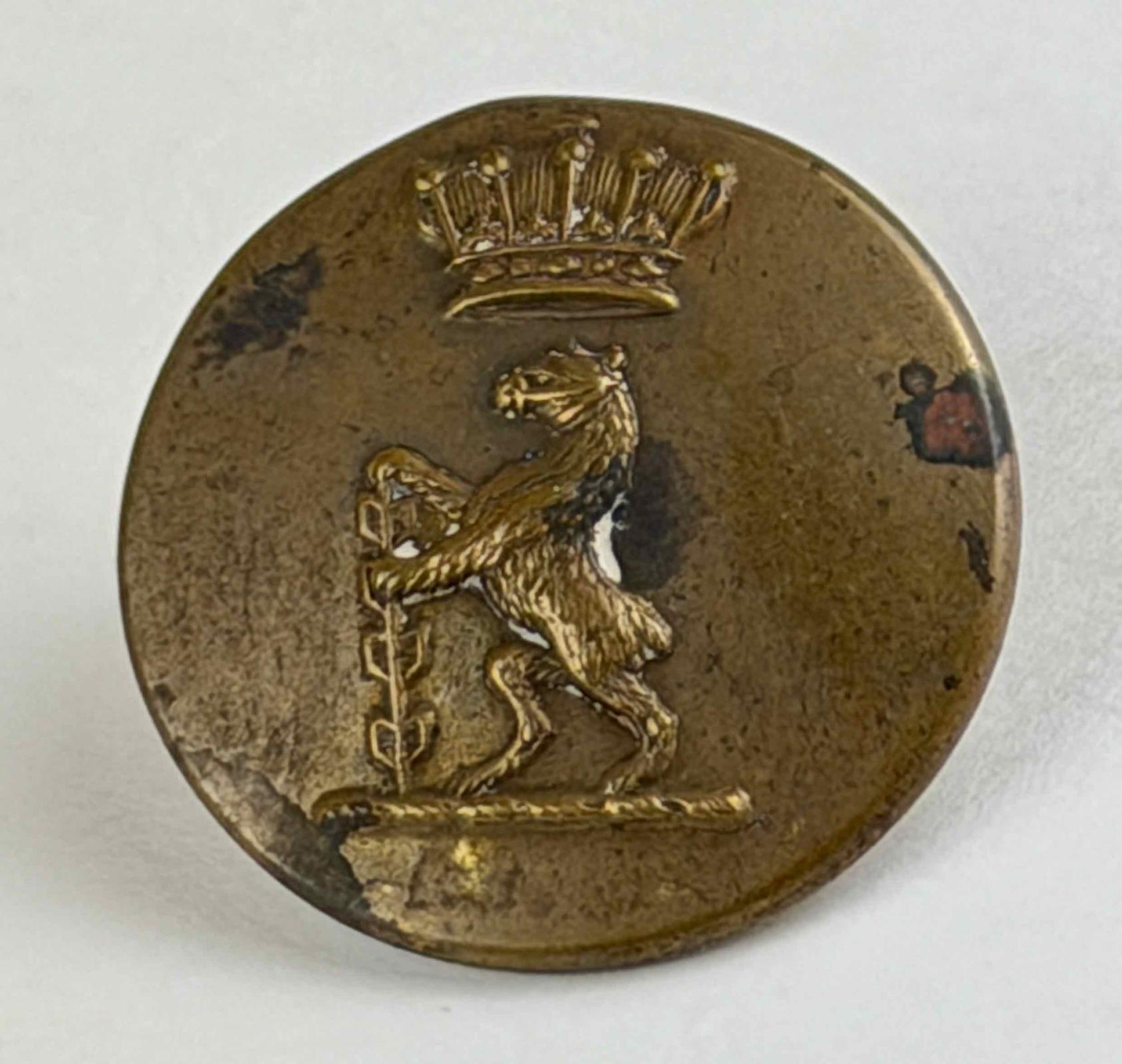 The button with the molded image of a standing bear or similar animal below a crown was made for use in livery, namely the uniforms of servants and staff of a household. The particular motifs derive from the family coat-of-arms. The family name for this livery button has not been identified. Also not identified is how this button came into the Historic Odessa collections. It may have been collected by Mary Corbit Warner.