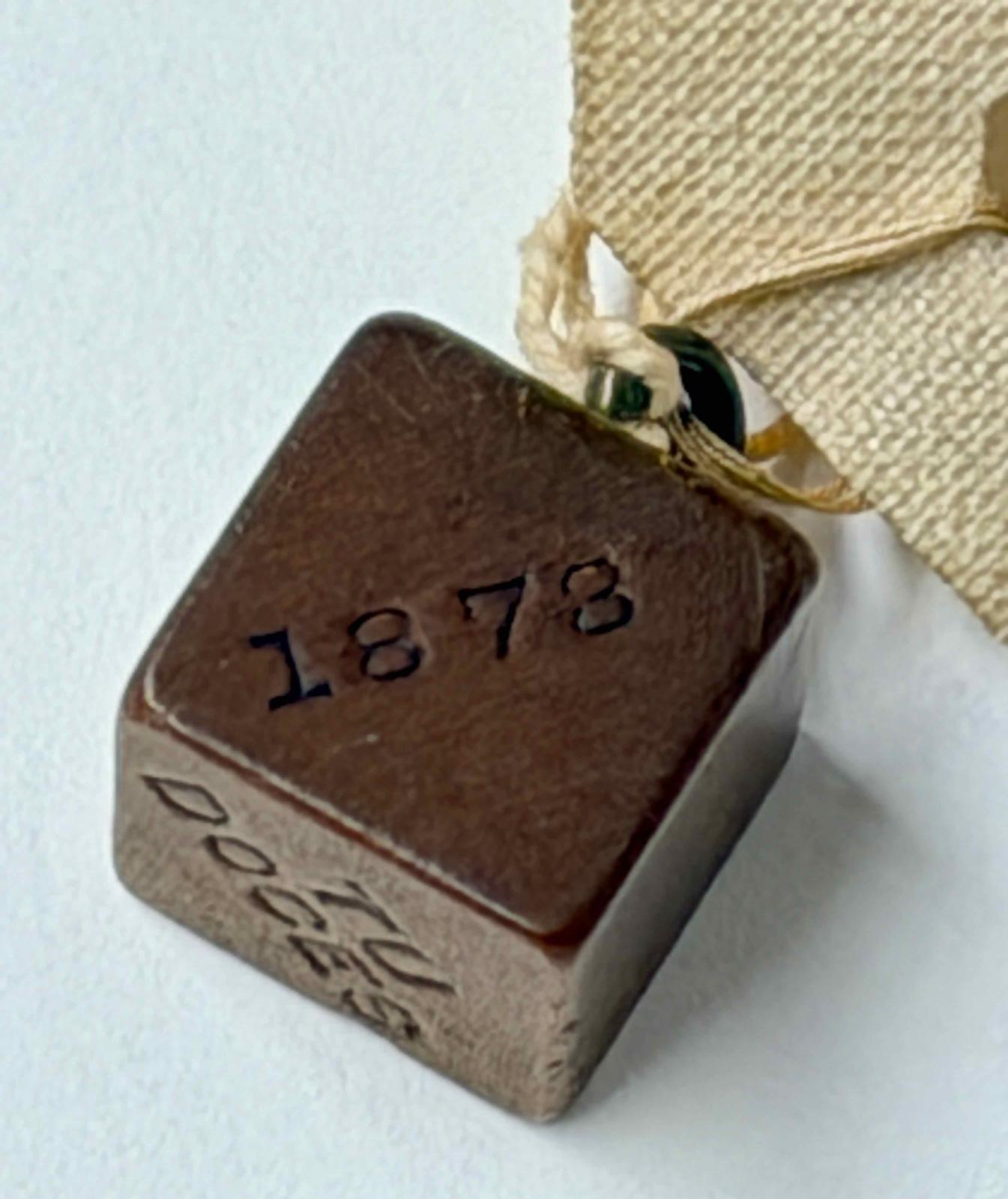The cube, cast of an unknown material, probably a ceramic, has a metal eye set into the middle of one face that allows it to be suspended as a charm. The dates 1773 and 1873 are cast into opposite faces, the dates representing the centennial of the Boston Tea Party. The face opposite the metal eye has “TU / DOCES,” Latin for “you teach.” The detailed label, written by Mrs. Mary Corbit Warner, indicates that this charm was made for a Sanitary Fair held in Philadelphia at the “Academy” in 1873. Sanitary Fairs began in 1863 as a means of raising money for hospitalized Union soldiers.