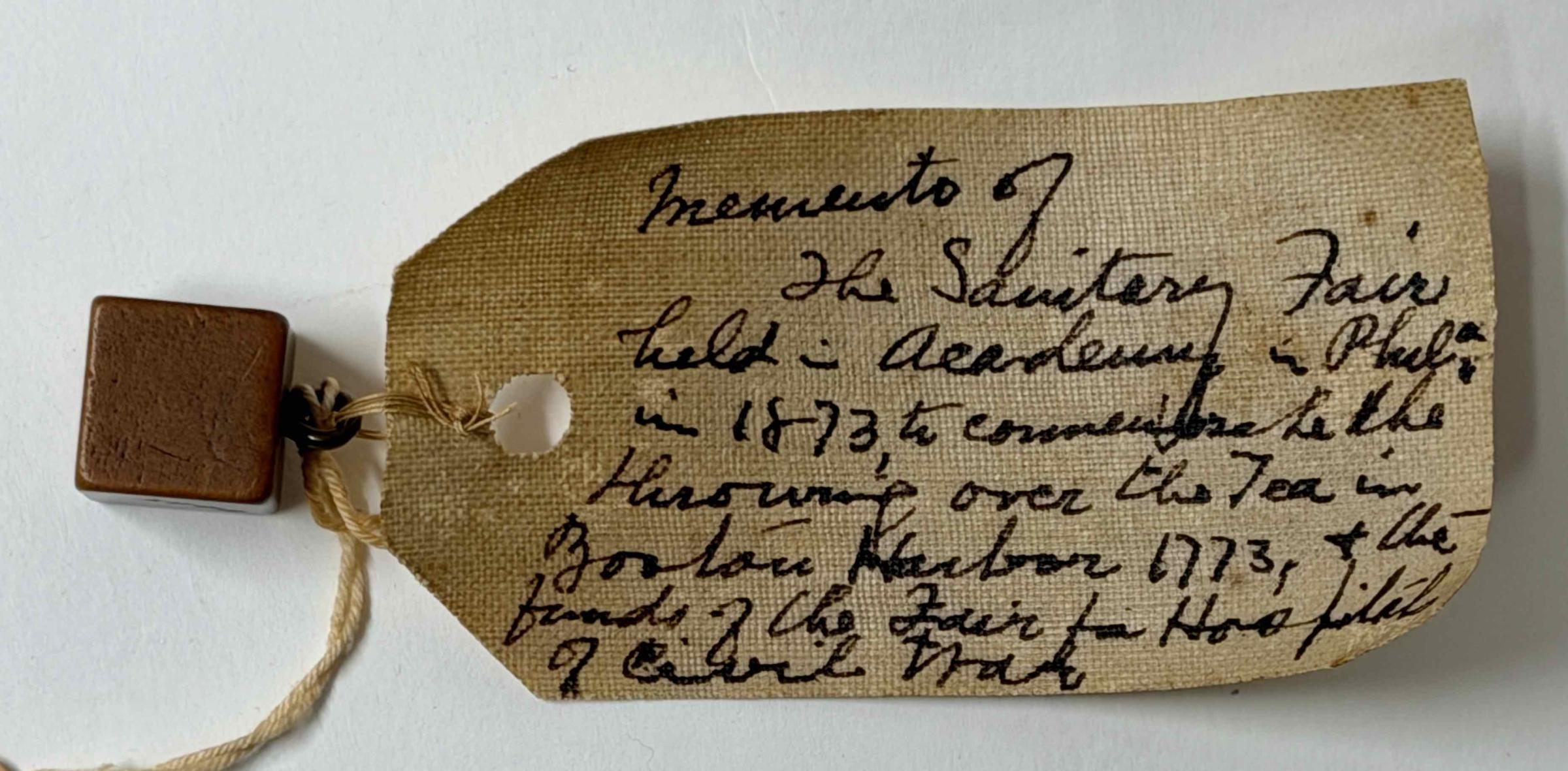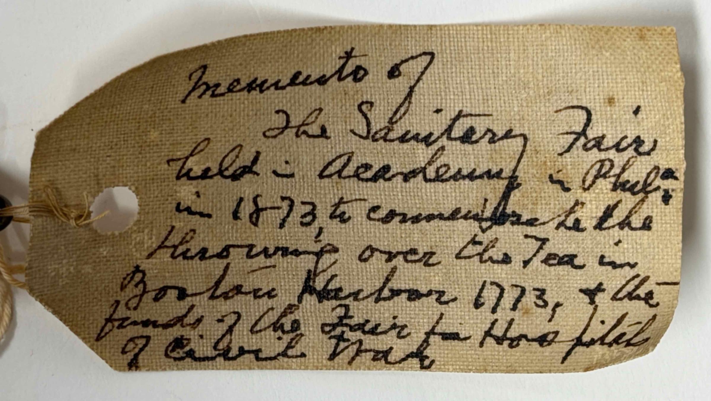 “Memento of / The Sanitary Fair / held in Academy in Phila / in 1873 to commemorate the / throwing over the Tea in / Boston Harbor 1773, + the / funds of the Fair for Hospitals / of Civil War” is written in ink on an attached label.