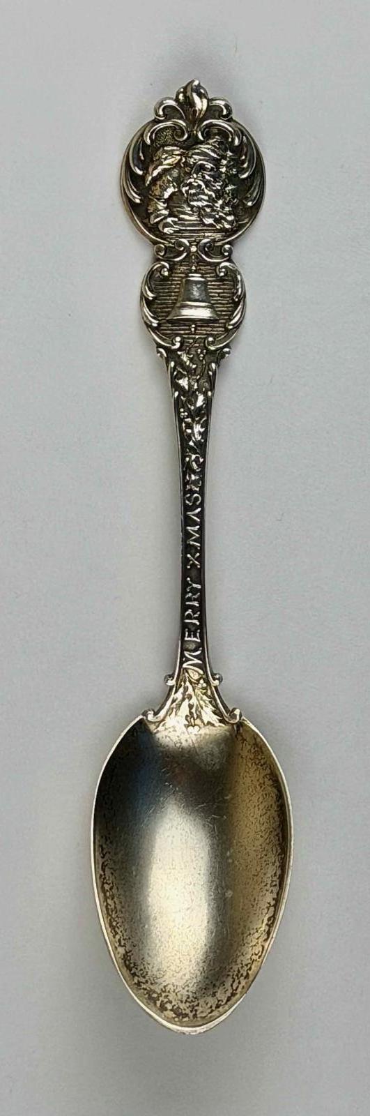 The ornate handle has a prominent bell on the face. The spoon has no connection to a place, although Christmas spoons were made after 1890.