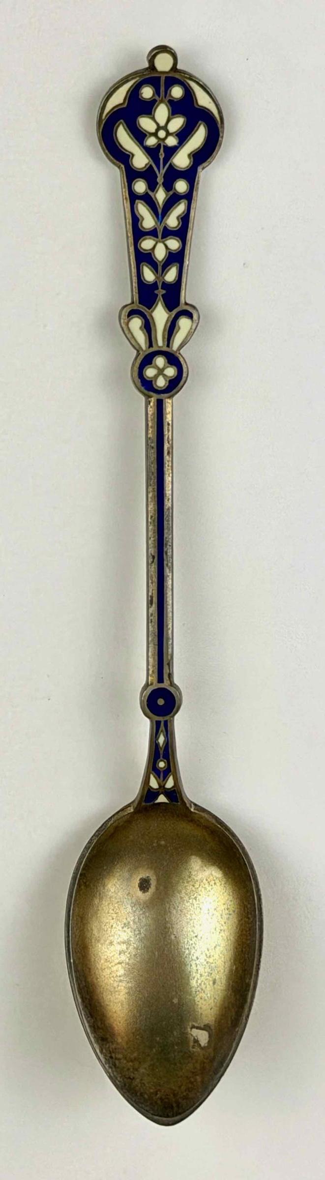 The spoon, whose maker remains unidentified, is decorated using a cloisonné technique in which enamels fill areas defined by metal walls. The handle is rendered in blue and white in stylized floral motifs.
