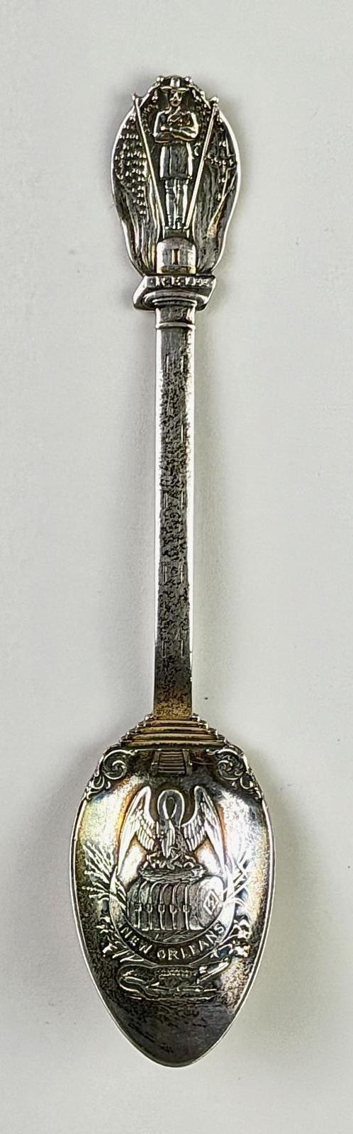 The spoon shows a pelican (the Louisiana State bird) on a nest atop a bale of cotton. An alligator is below the New Orleans banner. Above the images, stairs lead up a monument-type base, which becomes a columnar handle. At the top is a figure of a Confederate soldier. The flag to the right seems to be a Confederate flag. The one on the opposite side is less-well defined and may be an American flag. This same image appears on other spoons associated with Confederate states and people, notably Robert E. Lee.