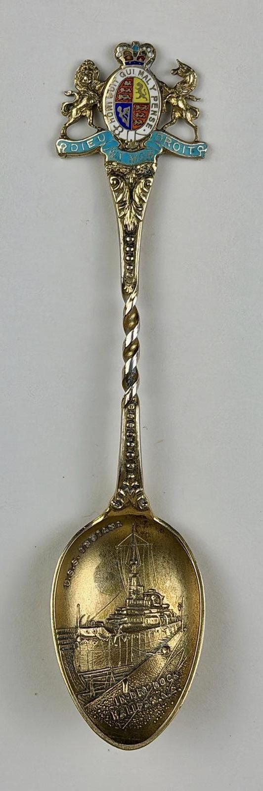This spoon bears British inscriptions and elements of the royal seal, notably the English lion and Scottish unicorn with a crown between them. Although the subject of the souvenir spoon is an American battleship, it was made by Roden Brothers of Toronto.