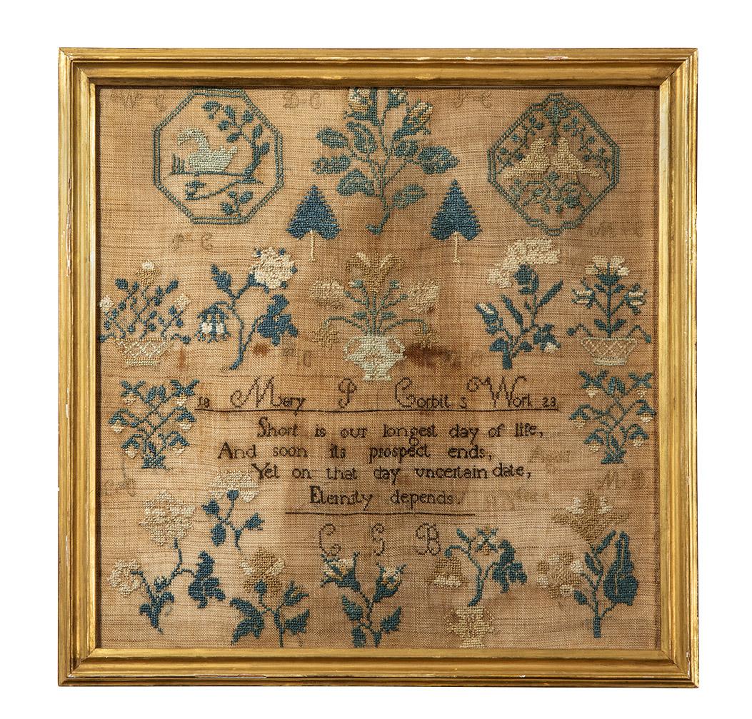 This sampler was made at the same time as Mary’s sister Sarah made hers (acc. no. 1977.222). At the time, each child (aged 10 and 12, respectively) was orphaned and under the charge of her uncle Daniel Corbit. His account book records “2 quarters tuition” paid to “C. Bradford,” who was Catharine Golden Bradford (c. 1799–c. 1880) and “1 Silver thimble [bought] at Smyrna” for each girl to cover some of their schooling expenses. He also paid for a “gilt frame for sampler” under headings for each child. (See “Daniel Corbit account book, Cantwell’s Bridge,” acc. no. 1959.4041, entries dated Apr. 14, 1823, p. 156.)