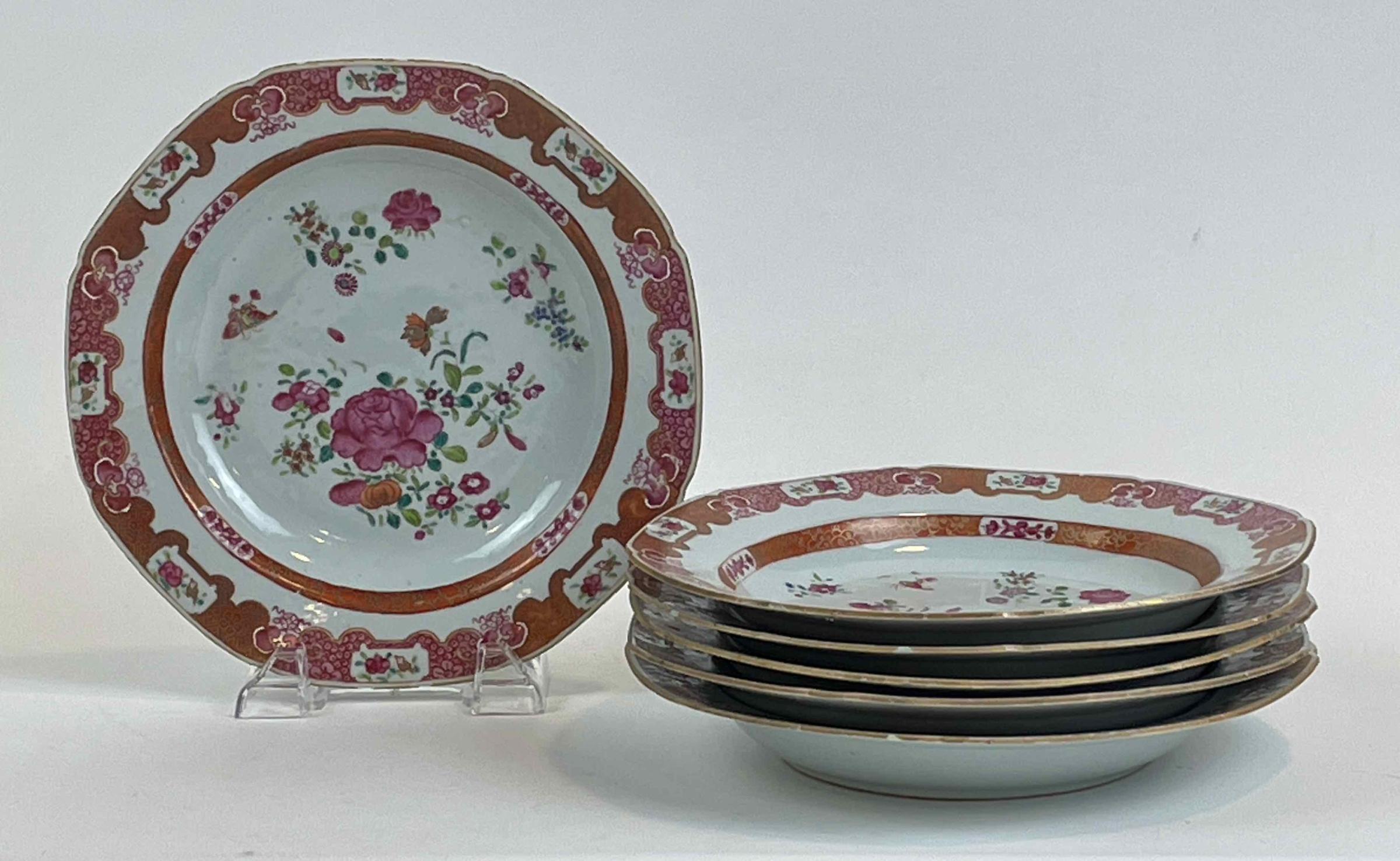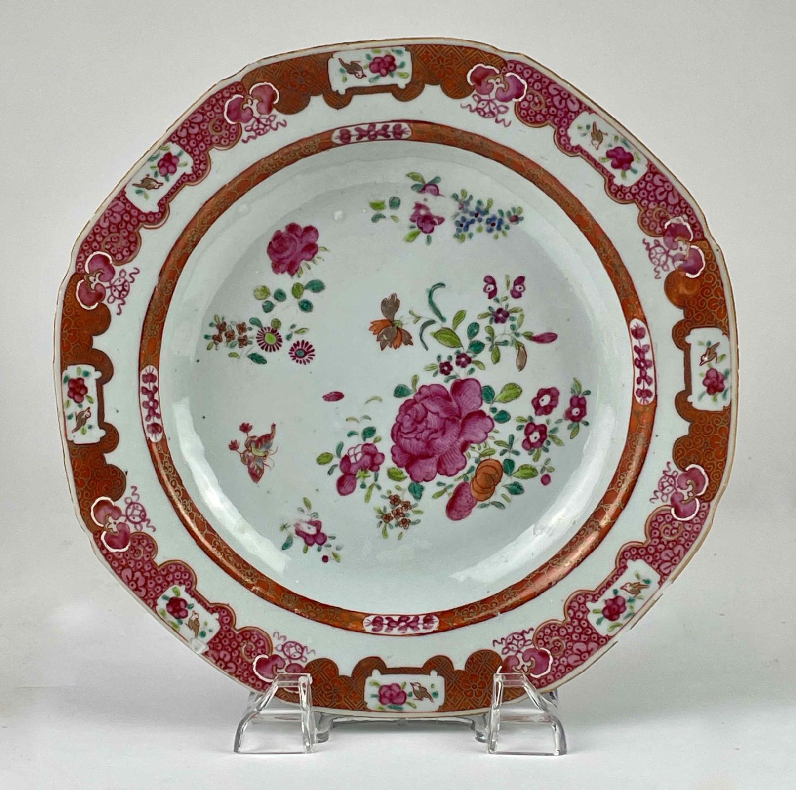 The set of deep dishes or soup plates is part of a large set of export porcelain tablewares featuring octagonal plates, platters, and deep dishes, as well as a pair of sauce boats. All share the same detailed and well-executed decoration. It displays vibrant use of “famille rose” enamels, namely a range of pinks that were developed for use on Chinese porcelains in the early 18th century. Other colors include greens, blue, reds, and gilding to create floral motifs and decorative bands. The central designs depict a large pink carnation with smaller floral sprays. A colorful butterfly-like motif is among the smaller sprays.