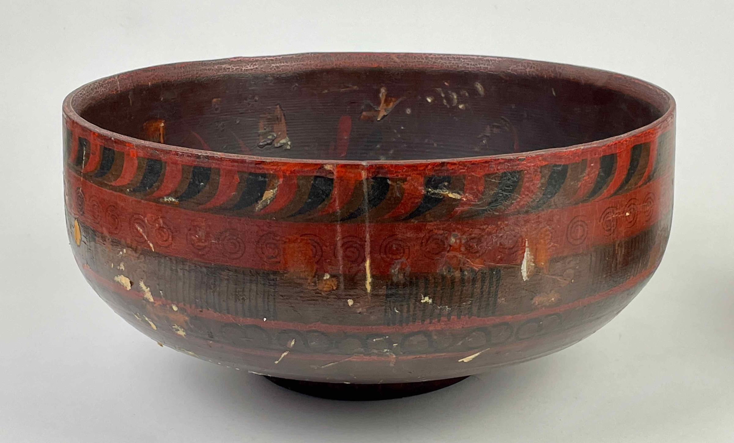 The decorative style of this bowl is often associated with Khokhloma painting, named for a region in Russia, but this bowl lacks the kinds of small flowers, berries, and leaf motifs that are typical of Khokhloma. Bowls similar to this one have geographical origins in several Scandinavian and other Northern European countries.