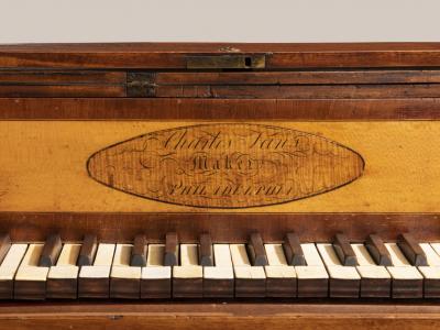 Since the 1770s, the pianoforte grew in popularity in American cultural centers to become the instrument of choice for refined social gatherings in the 1790s and later. Its primary advantage over the harpsichord and related keyboard instruments that plucked strings to produce sound was better control over the sound volume: by controlling a damper on the leather-wrapped hammers that struck the tuned wires, players could play soft (piano) or loud (forte). This pianoforte has 36 ivory keys and 25 ebony ones, providing a range of five octaves. Its case is made of fine mahogany and other exotic woods and meticulously crafted. About a dozen pianofortes by Charles Taws are known.