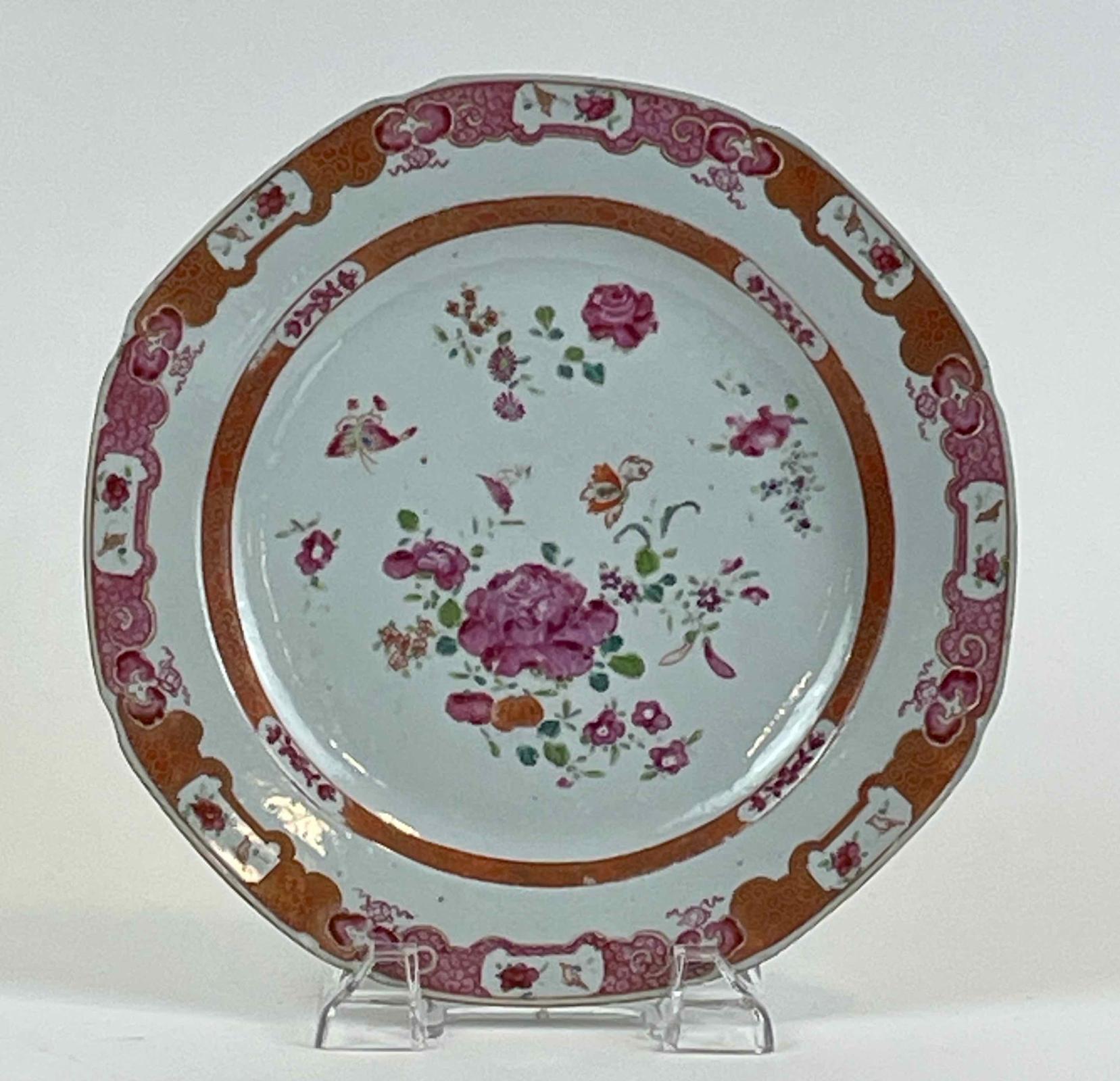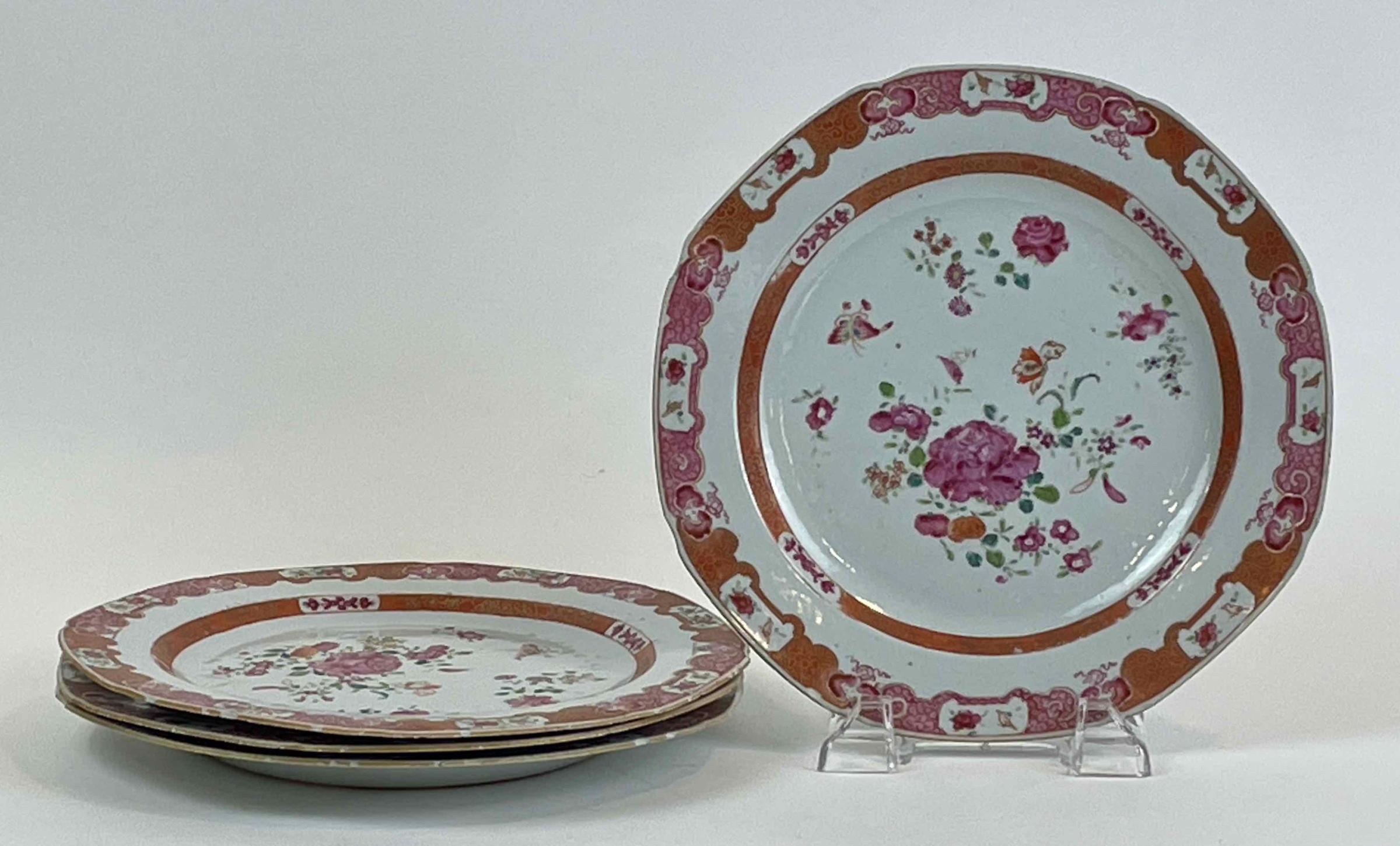 This set of four plates is part of another group of five identical plates that also descended from heirs of H. Rodney Sharp, accession no. 2011.104. The nine plates belong to a large set of export porcelain tablewares featuring octagonal plates, platters, and deep dishes, as well as a pair of sauce boats. All share the same detailed and well-executed decoration. It displays vibrant use of “famille rose” enamels, namely a range of pinks that were developed for use on Chinese porcelains in the early 18th century. Other colors include greens, blue, reds, and gilding to create floral motifs and decorative bands. The central designs depict a large pink carnation with smaller floral sprays. A colorful butterfly-like motif is among the smaller sprays.