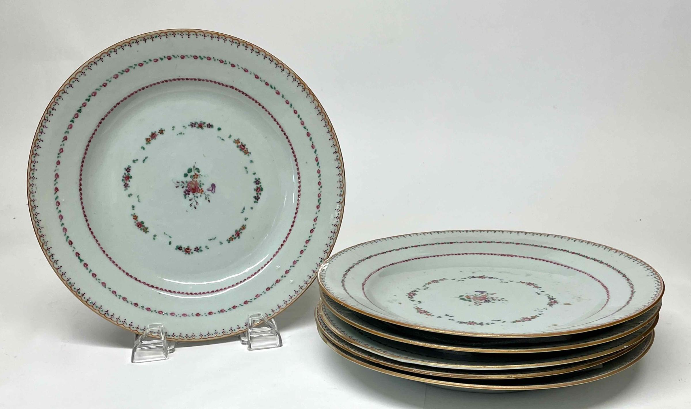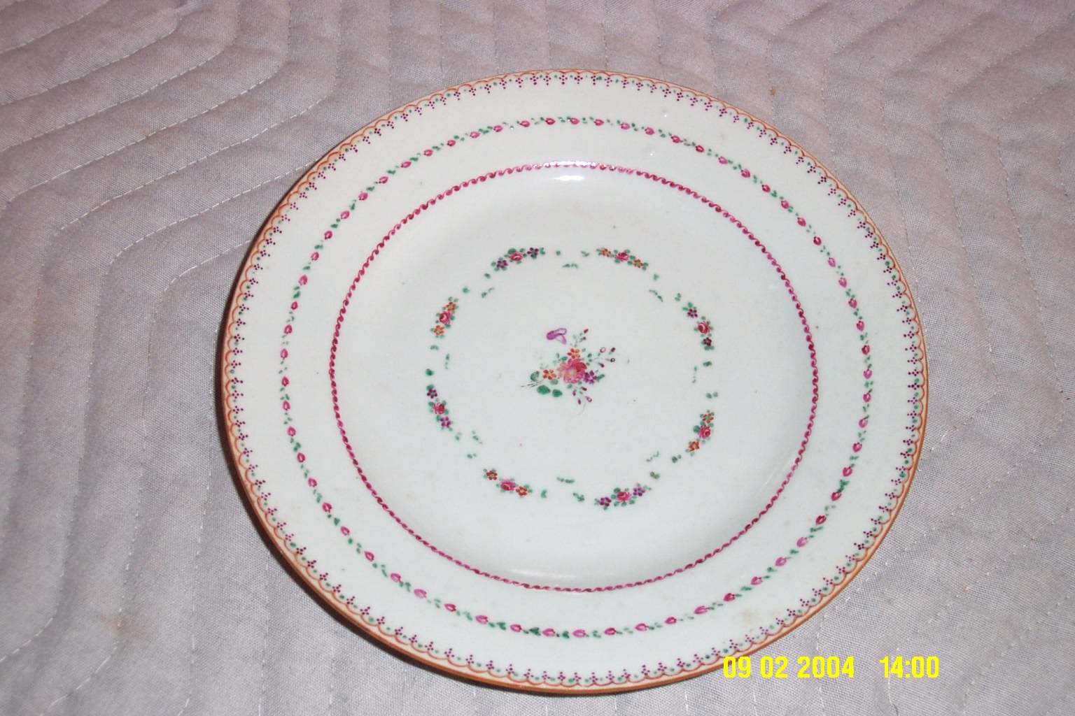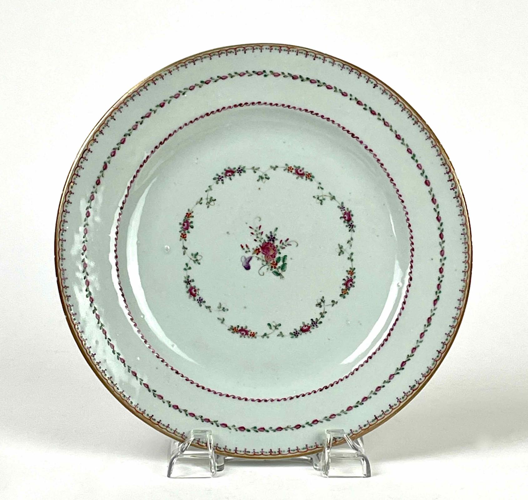 The plates in this set of six have three delicately painted, narrow bands, rendered in purples and greens, around the rim. The outer edge is gilded. A deep red rose in the center of the plate has purple and green flowers and leaves arranged is a spray. A ring of eight floral clusters in purples and greens surrounds the center. The undersides of the plates have unglazed and chamfered foot rings. The plates have some imperfections (lumps) in the clay body.