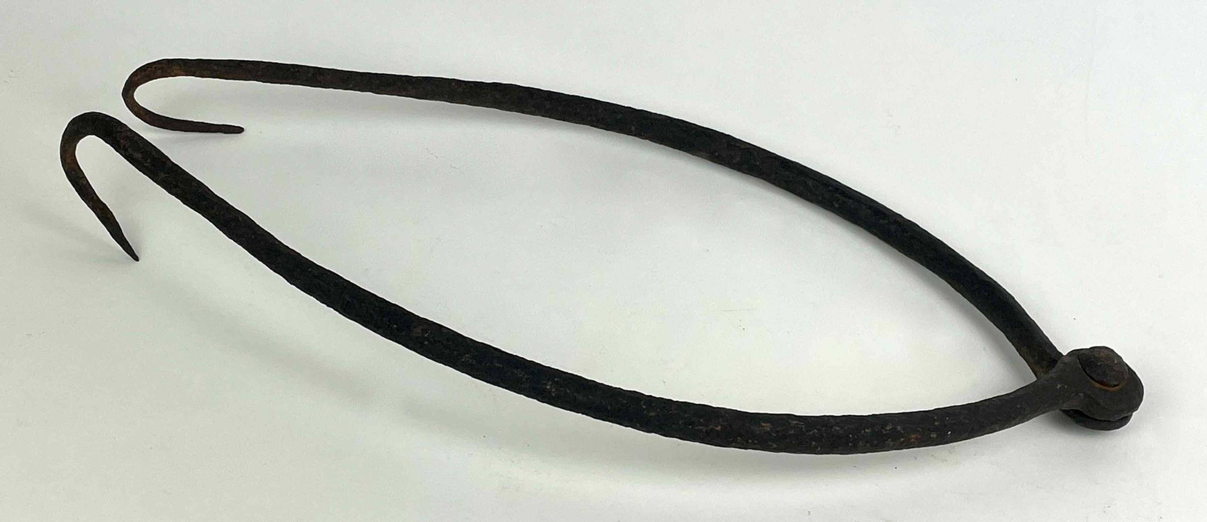 The pot handle, designed to remove handled vessels from a hot fire, has two inwardly curved and tapered arms that join at a simple hinge. The opposite ends are turned upward to form hooks.
