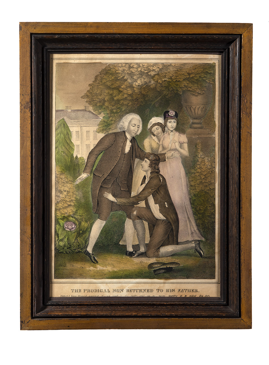 The print is the last in a series of four that illustrate the well-known story of the Prodigal Son, related in the Bible, Luke 15:11-32. He accepted his patrimony, left home and squandered it, and found himself destitute. The last print in the series shows him reconciled with his father. The three other prints are accession nos. 1959.3784, 1959.3785, and 1959.3786. All of the images follow a four-print set of colored etchings made in 1814 by Amos Doolittle (1754-1832) and published by Shelton & Kensett of Cheshire, Connecticut.