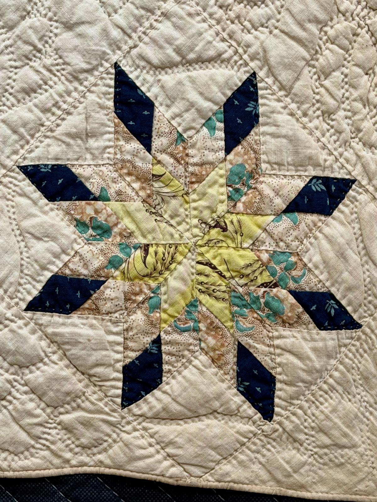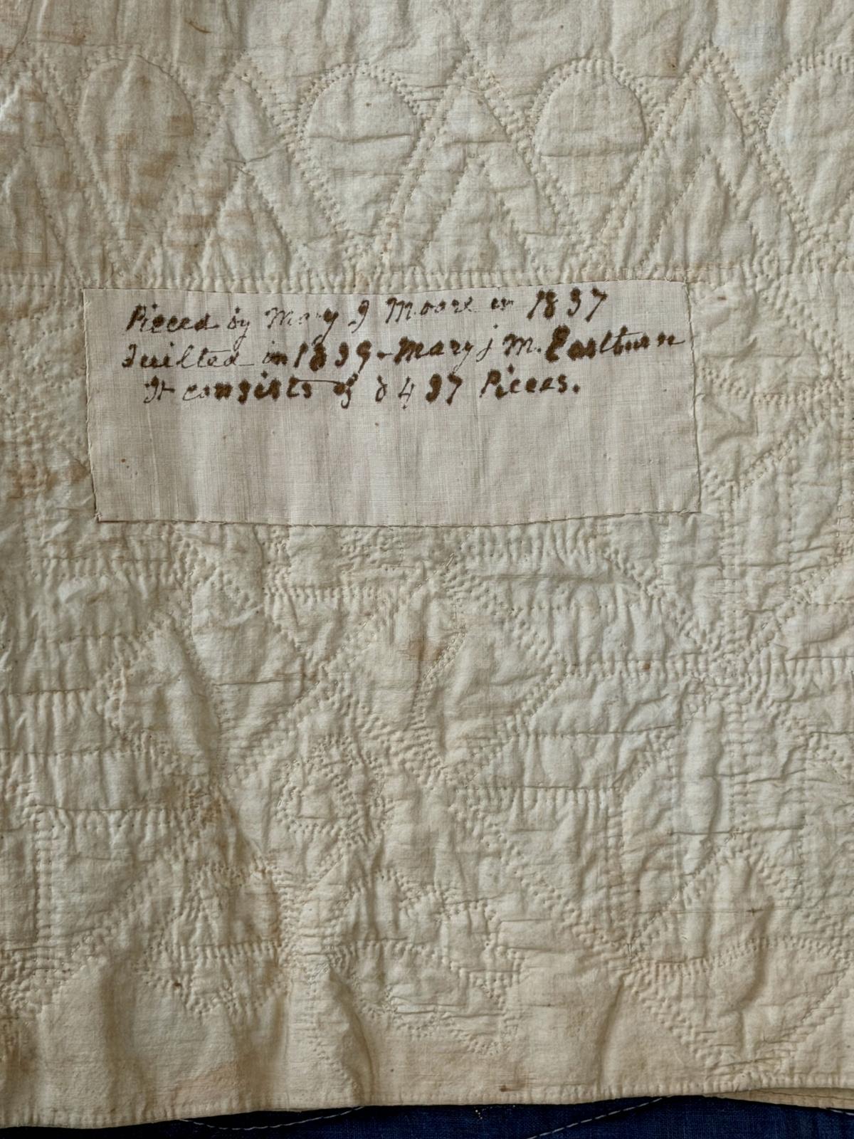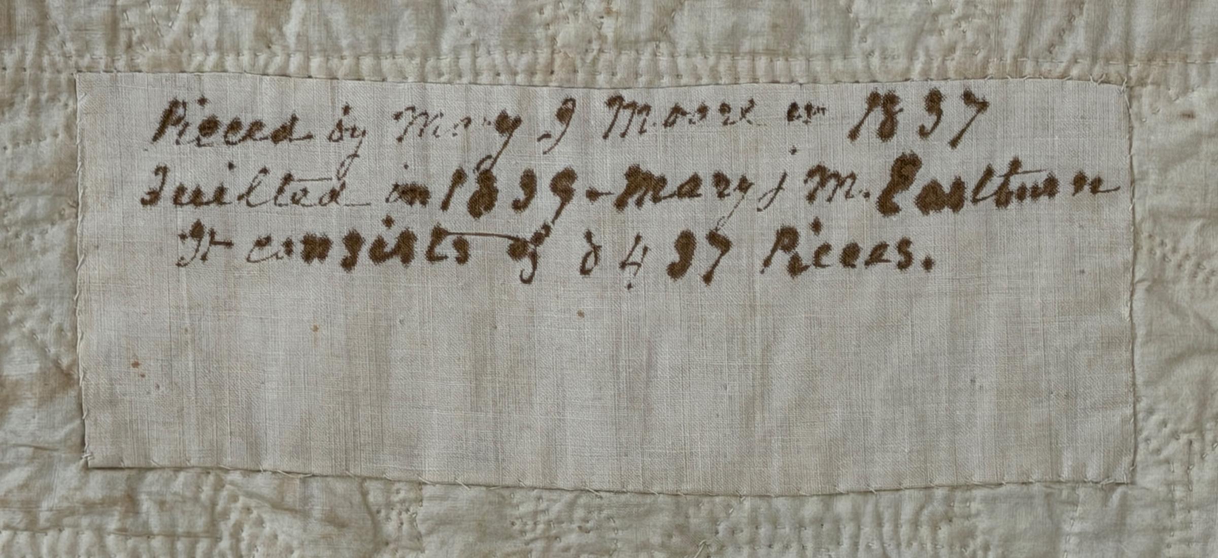 “Pieced by Mary J Moore in 1837 / Quilted in 1839 – Mary j M. Eastburn / It consists of 8437 Pieces.” Is written in ink on a rectangular panel stitched to the underside near the middle of one side near the edge.
