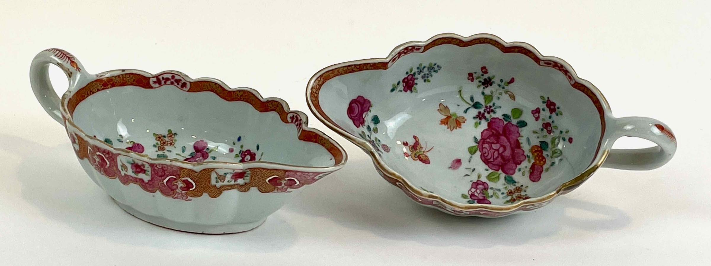 All objects in the set share the same detailed and well-executed decoration. They display vibrant use of “famille rose” enamels, namely a range of pinks that were developed for use on Chinese porcelains in the early 18th century. Other colors include greens, blue, reds, and gilding to create floral motifs and decorative bands. The designs on the plates depict a large pink carnation with smaller floral sprays, and a colorful butterfly-like motif. These sauce boats are decorated with the complex and lush borders used on the plates. They have a deep band around the outside with a scalloped bottom edge and alternating use of rose and burnt orange sections, each of which incorporates a rectangular panel depicting a bird and a flower. The borders have gilded highlights. White enamels set off certain parts of the decoration. The inner border is a smaller and simpler version.