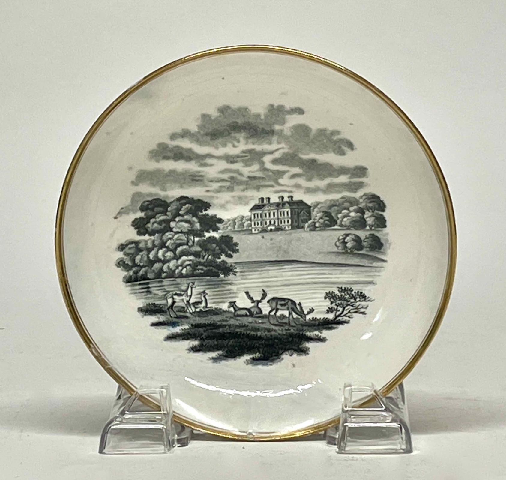 This deep saucer is part of a partial service of one slop bowl (1971.757.1), three coffee cups (1971.757.2-.4), a tea cup (1971.757.5), thirteen deep saucers (1971.757.6-.18), and four small plates (1971.757.19-.22). The service is decorated with black transfer-printed designs of "Stately Homes," being images of English country houses and ruins. This saucer shows an image of country house in the distance with a body of water in front and five deer in the foreground. The rim has a thick and a thin gold band around the inside.