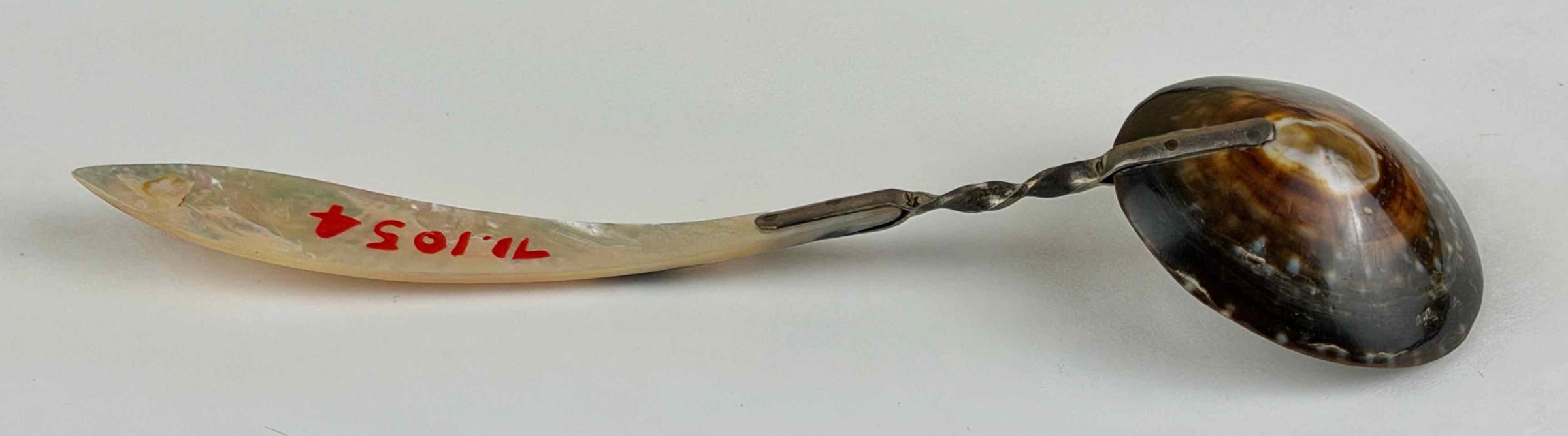 This small spoon is made of brightly iridescent mother-of-pearl (also called nacre) and silver. The bowl is a shallow shell, polished to its present shape and surface texture. A short silver tab, twisted twice in the middle, is riveted to the shell bowl and to the handle. The handle is especially vibrant.