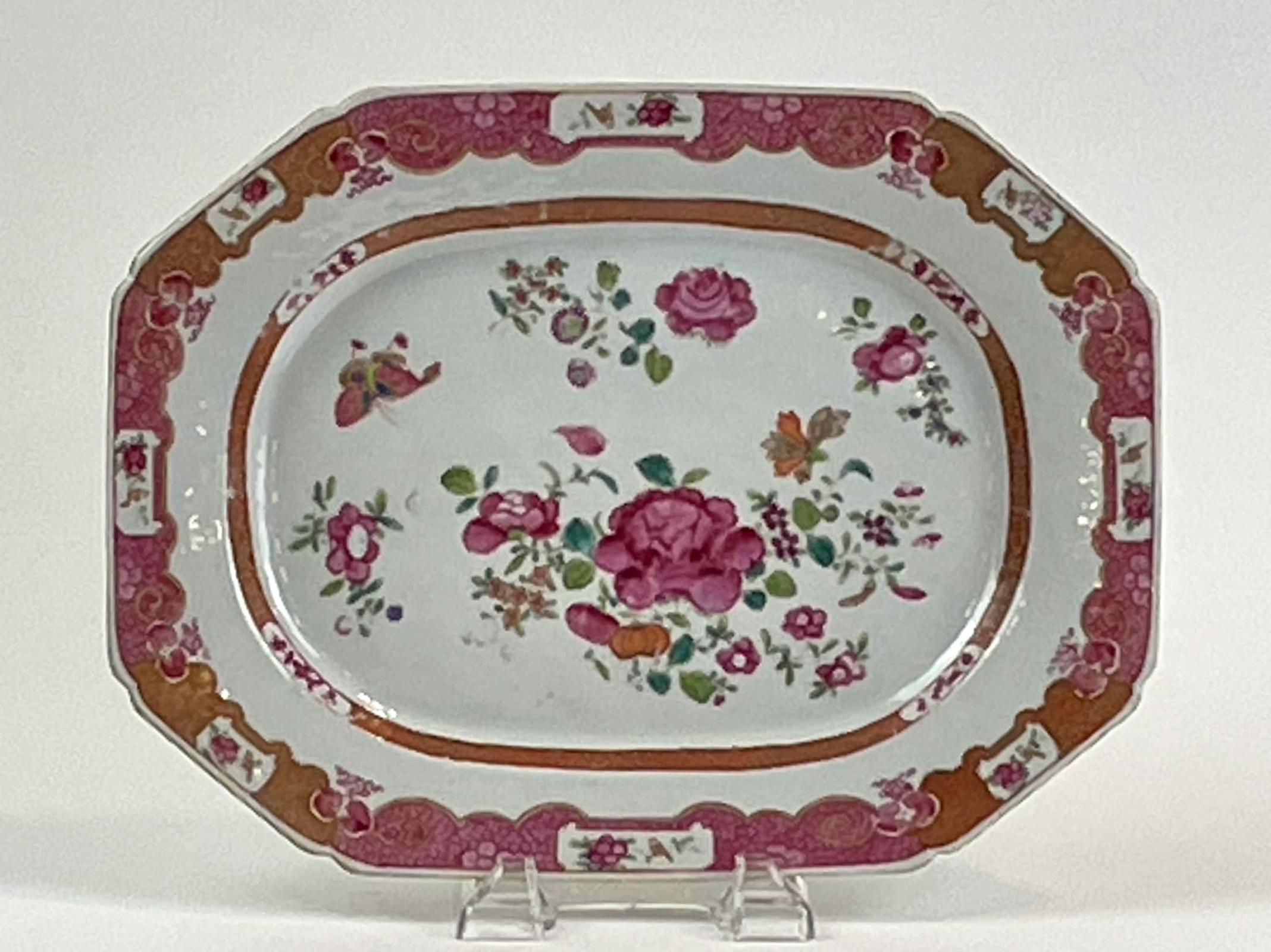 This small platter is part of a large set of export porcelain tablewares featuring octagonal plates, platters, and deep dishes, as well as a pair of sauce boats. All share the same detailed and well-executed decoration. It displays vibrant use of “famille rose” enamels, namely a range of pinks that were developed for use on Chinese porcelains in the early 18th century. Other colors include greens, blue, reds, and gilding to create floral motifs and decorative bands. The central designs depict a large pink carnation with smaller floral sprays. A colorful butterfly-like motif is among the smaller sprays.