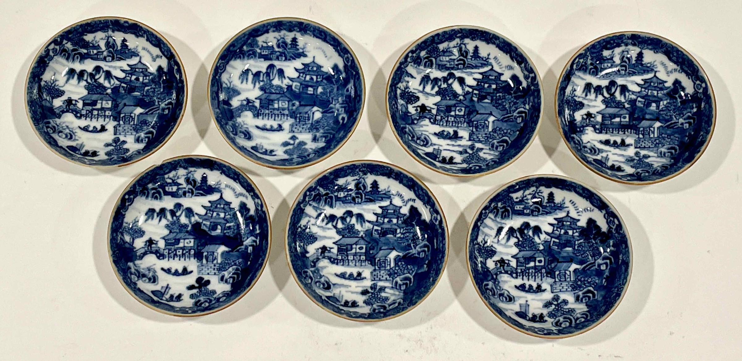 All of the saucers are decorated in a rich cobalt blue and depict characteristic Nanking scenes. They show a pagoda among other Chinese buildings, a meandering waterway separating islands, a Chinese figure carrying water containers across a bridge, and other Chinese figures in boats. They have finely rendered floral band around the inside edges, which have gilded rims.