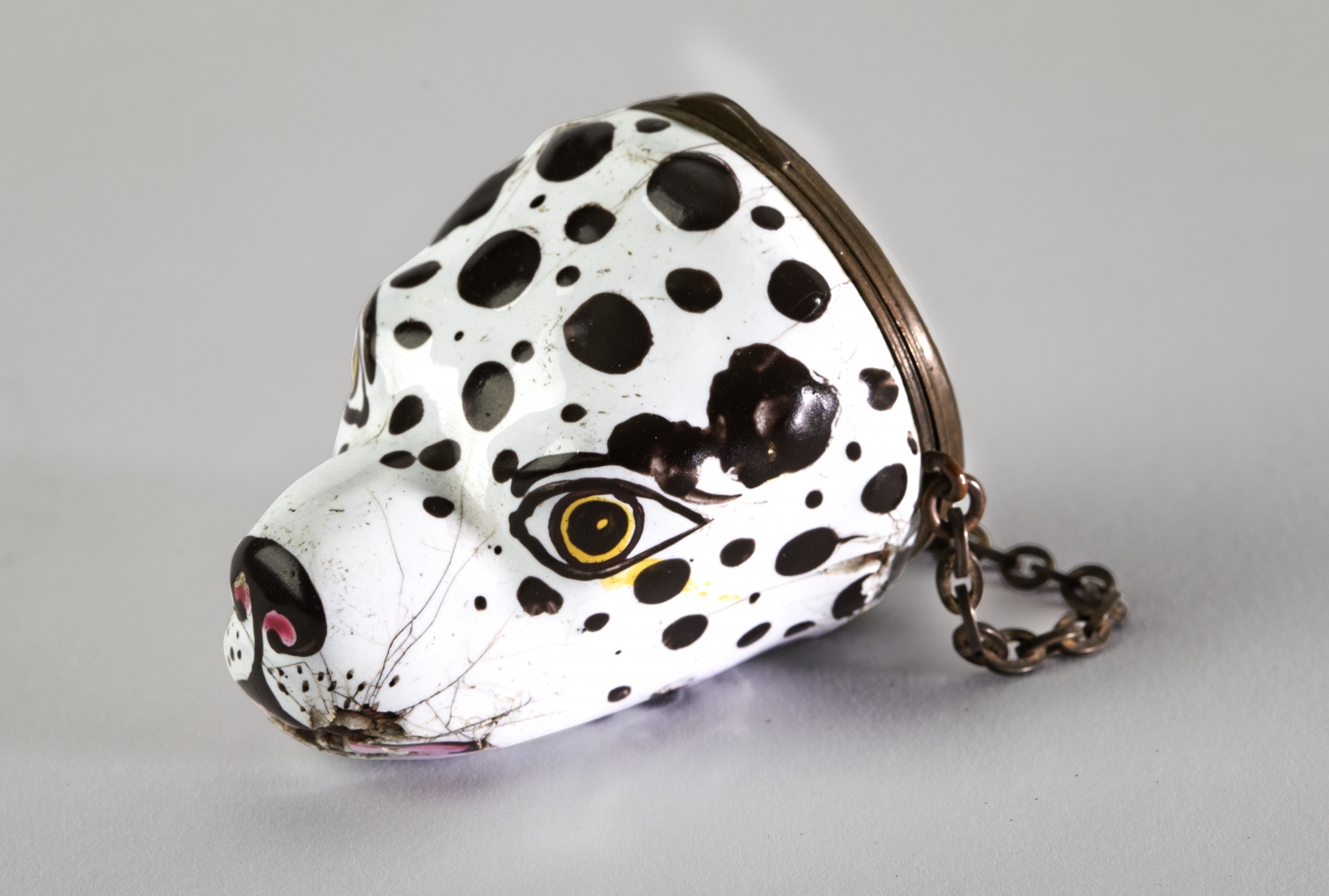 Taking snuff, a refined tobacco product of selected and specially cured leaves, finely cut, and often scented with perfumes, herbs, spices, or wines, was inhaled through the nose. The cost of snuff compared to smoking and chewing tobacco limited it to wealthy men and women. Snuff boxes were part of the social ritual. This engaging box shaped and painted like a Dalmatian associates it with gentlemen, who might have owned such a dog. A small piece of paper written by Mrs. Warner about 1900 states that this snuff box was owned by Captain James Jefferis, father of Ann, who married David Wilson Jr. in 1808.