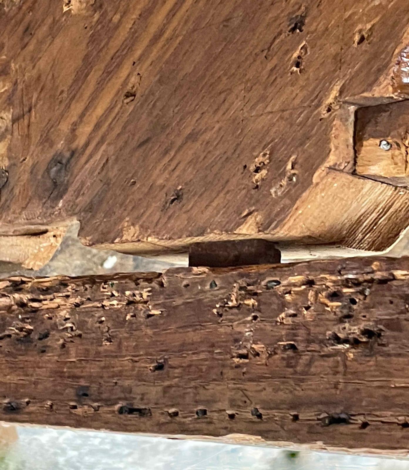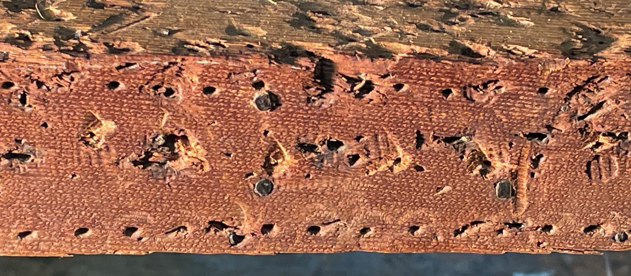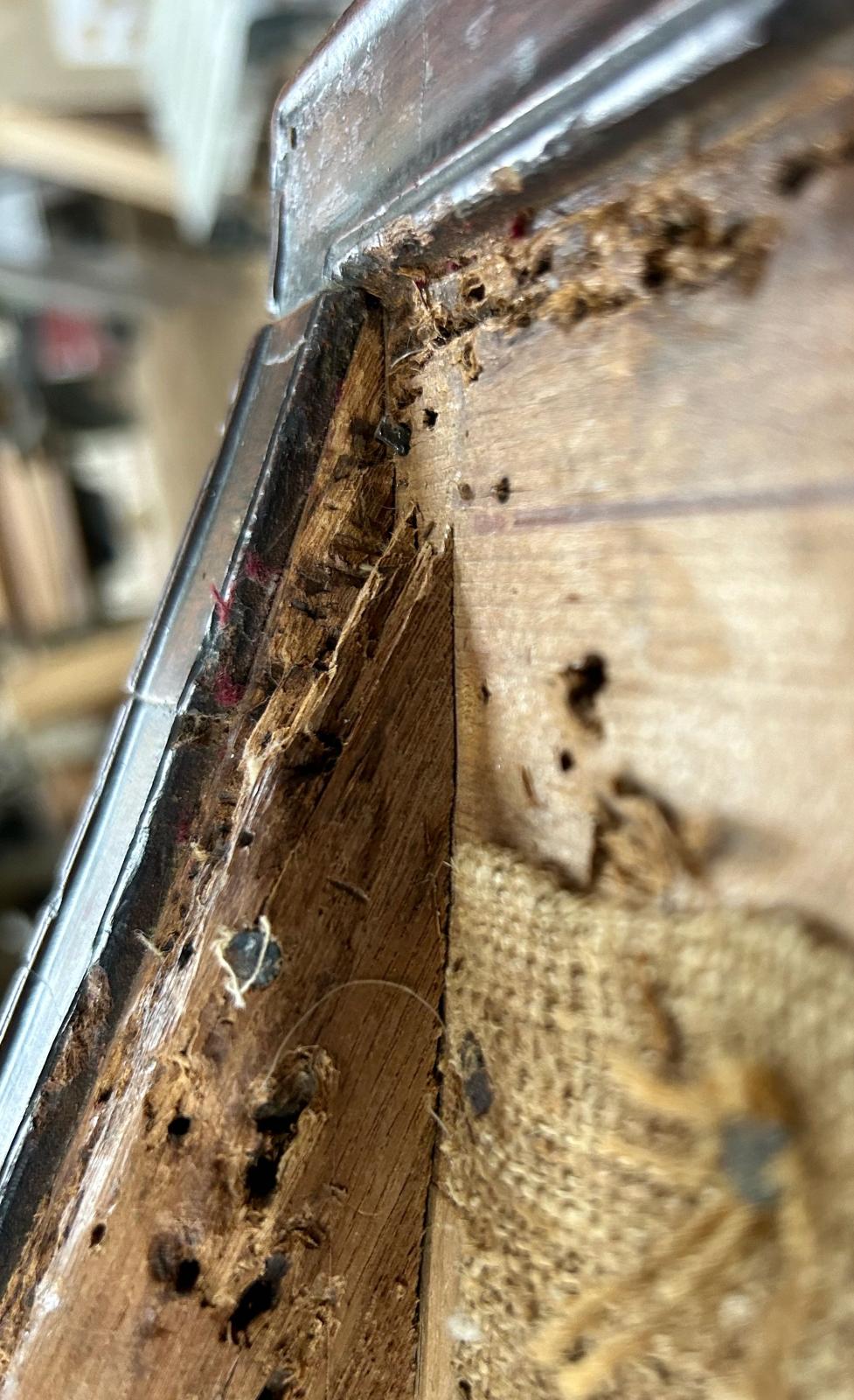 Evidence for use of decorative brass tacks along the edges of the frame is clear on the front seat frame and elsewhere.