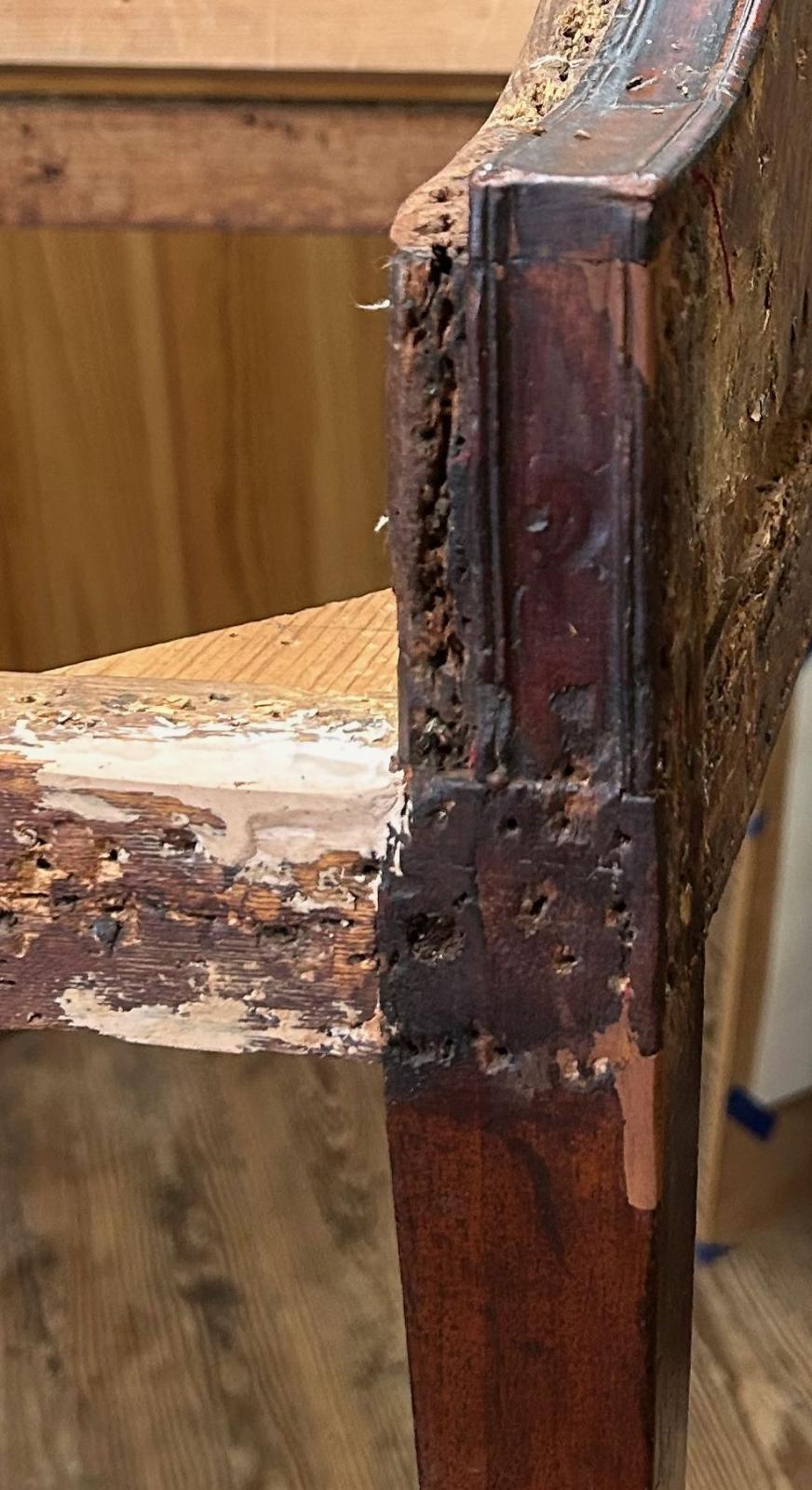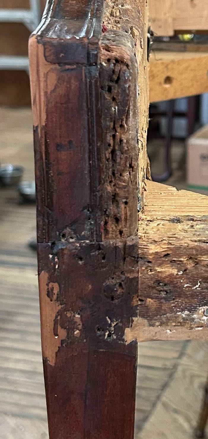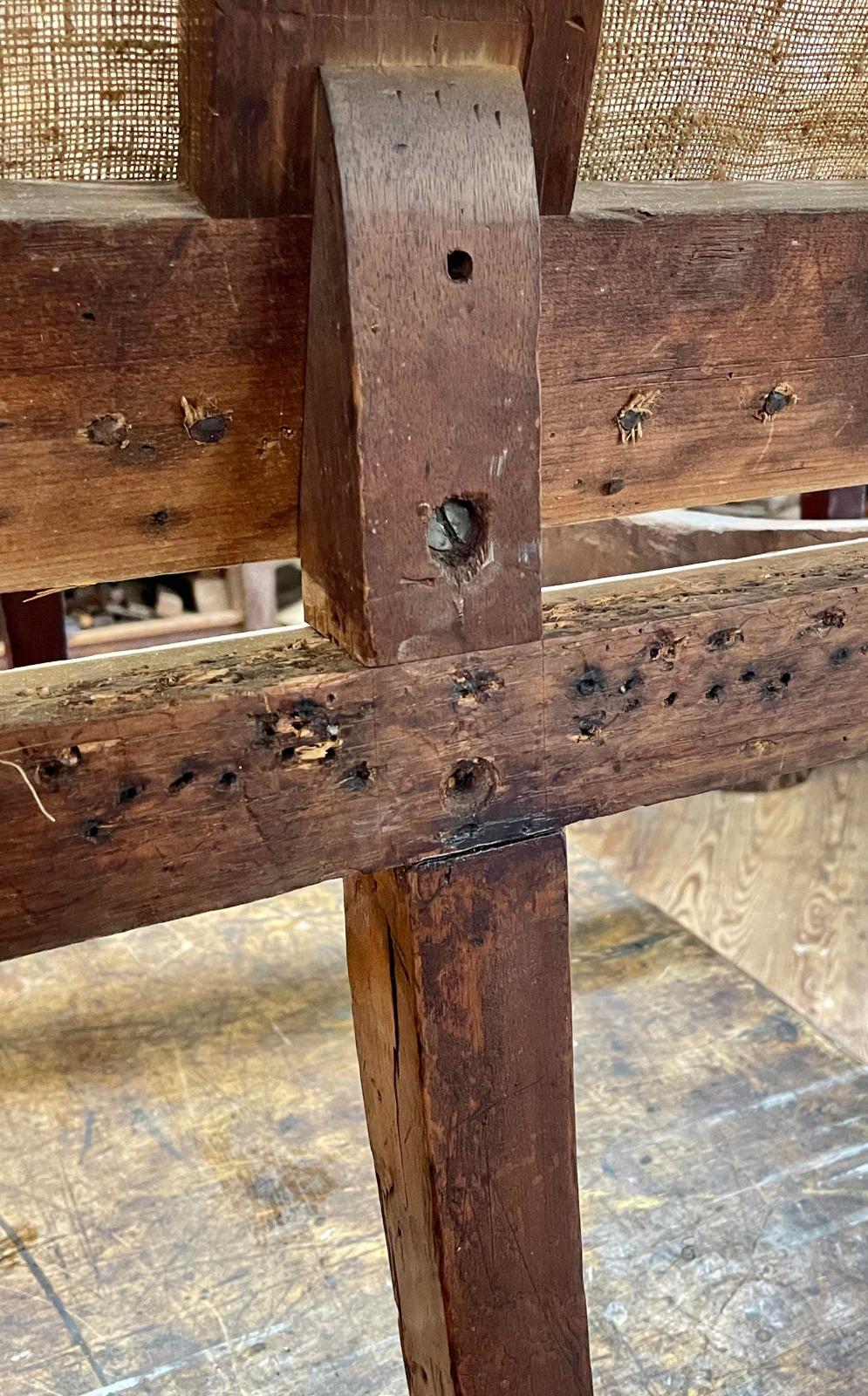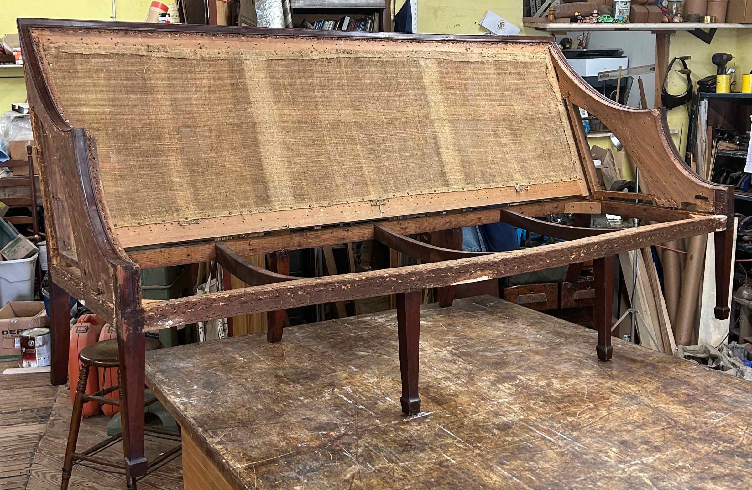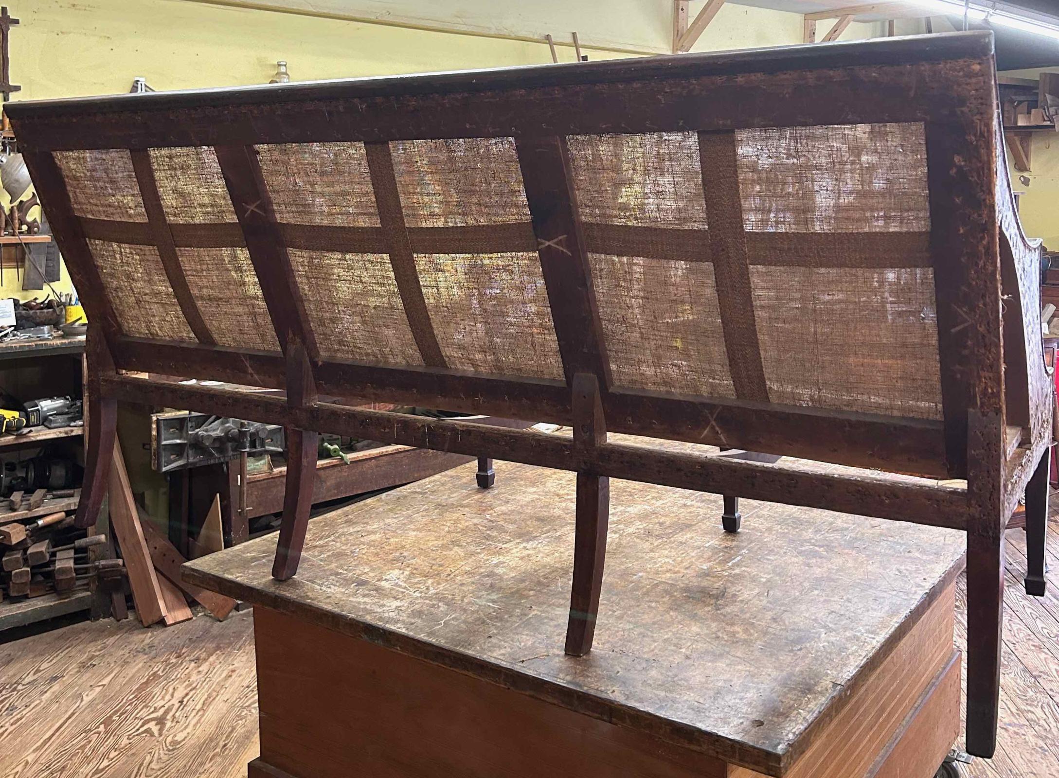 The frame is well preserved with relatively few tack holes and no alternations. Triangular corner blocks were added to the seat frame. The double tenons that attach the middle rear legs to the frame have been reinforced with dowels. The left center rear leg split and was repaired with finishing nails. It was reinstalled about 1/4-inch closer to the side and has since been restored to its correct position. Small areas of loss along the mahogany outlining of the frame have been infilled and colored to match.