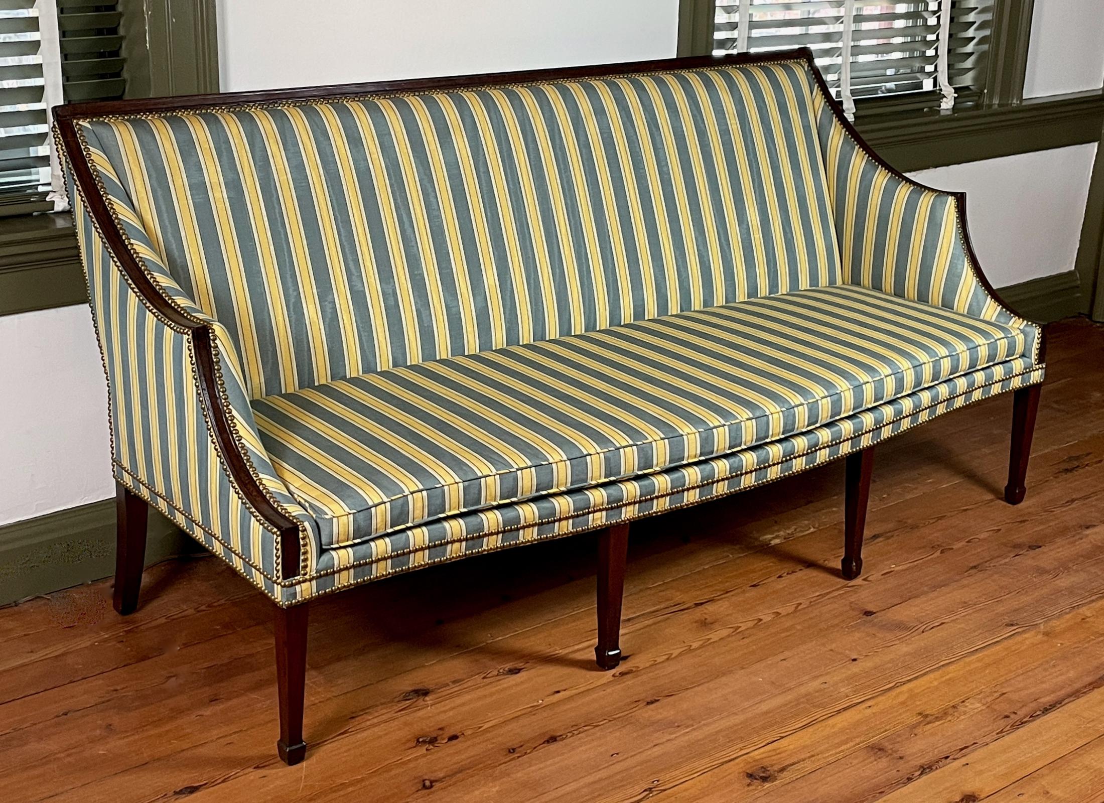 The rectangular sofa stands on eight square tapered legs that end in spade feet in front; the rear feet are squared, taper slightly, and curve gently towards the back. The front seat rail swells forward in the middle. The sides of the sofa curve down from the crest to a point and then curve again to the front. The upholstery was originally tacked to the frame using brass-headed tacks placed next to each other, as evidenced by impressions in the wood of the frame. Strips of mahogany outline the frame of the back and the tops of the sides.