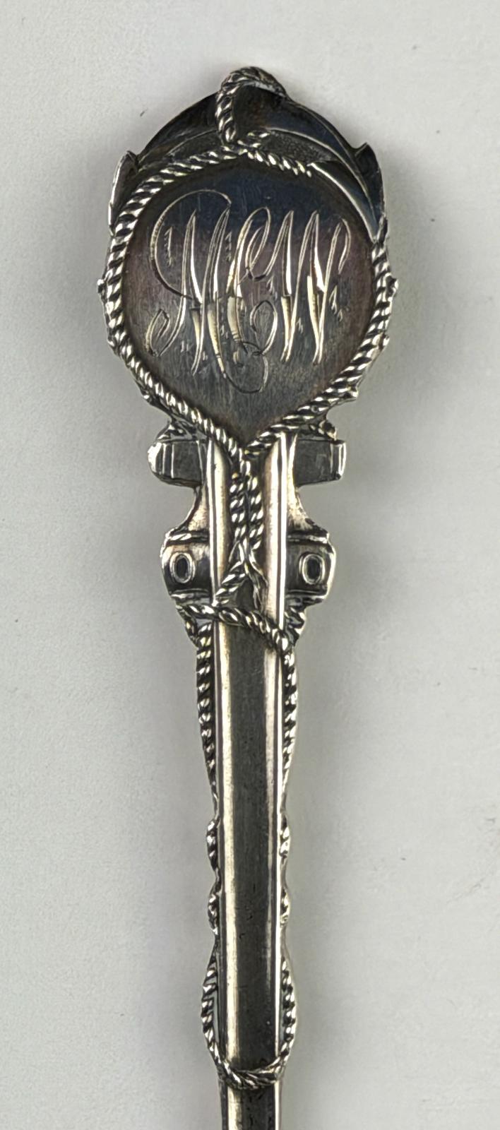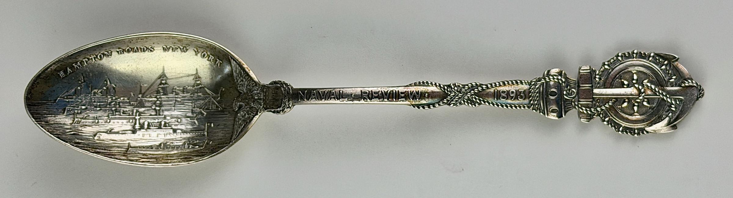 “HAMPTON ROADS NEW YORK” is inside the bowl; “NAVAL REVIEW” and “1893” appear on the face of the handle. "MCW" in script is engraved on the underside of the handle tip.