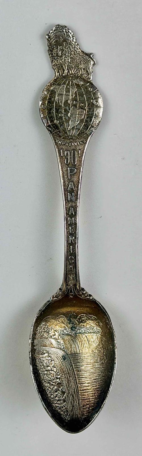 This spoon celebrates the 1901 Pan-American Exposition held in Buffalo, New York. The fair intended to spotlight cultural and commercial accomplishments of countries from the Western Hemisphere. It was held three years after the Spanish-American War. It was also the time and place when President William McKinley was assassinated.