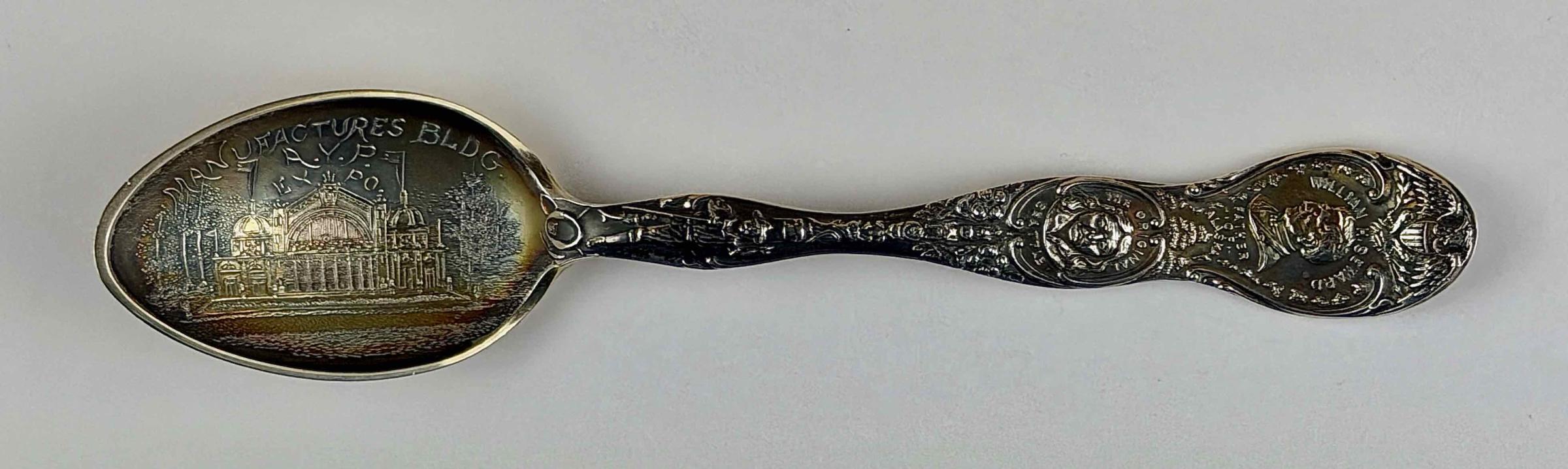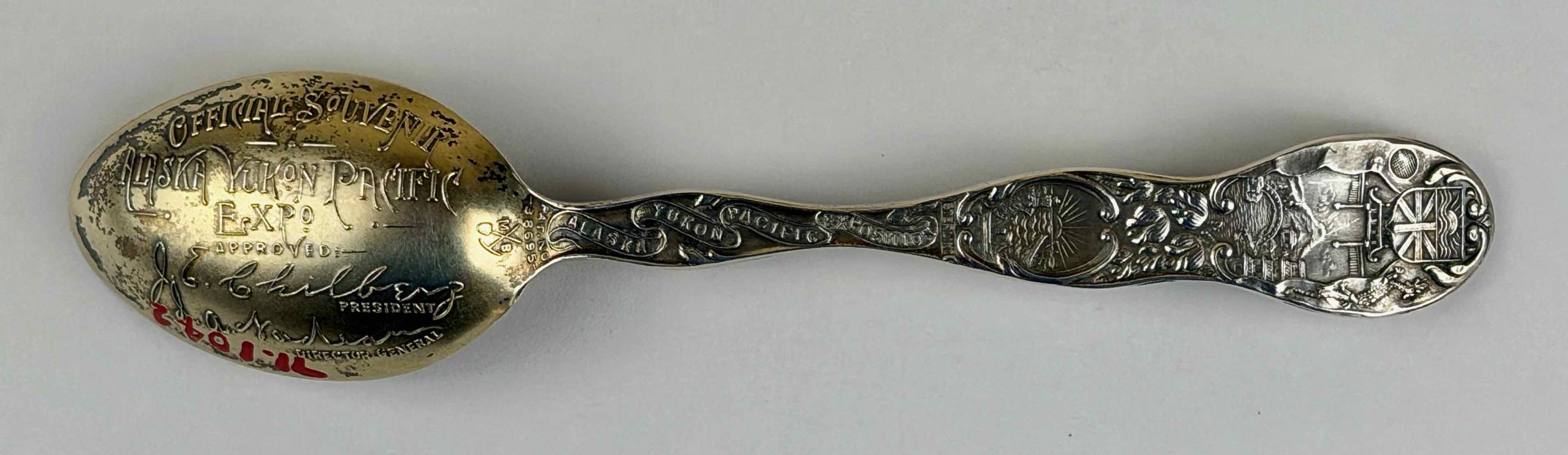 This spoon, an "official souvenir," is covered with words, front and back and all about the Alaska-Yukon-Pacific Exposition, held in 1909 in Seattle. Foremost on the spoon are the “Manufactures Building” inside the bowl and, on the handle, a profile of William Seward above one of Chief Si’ahl (1780-1866), leader of the six local tribes on central Puget Sound. The back of the spoon has many images intended to evoke the variety and expanse of those different people and cultures engaged in this World’s Fair. The underside of the bowl has “approval” signatures of the fair president and director below “OFFICIAL SOUVENIR.”
