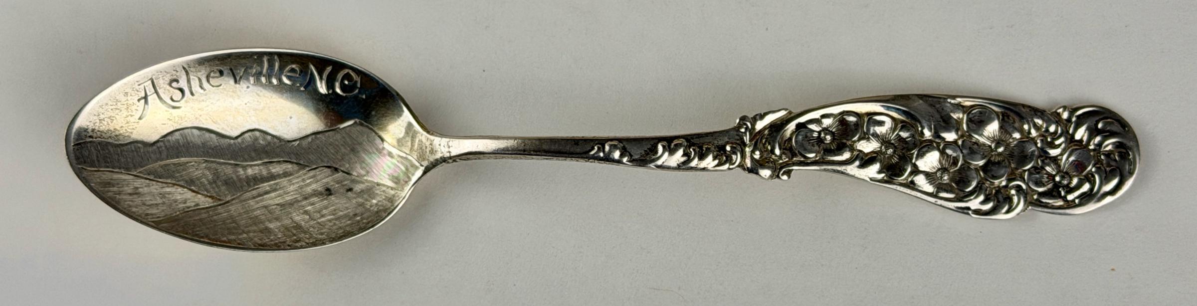The spoon exhibits a mountain scene with “Asheville N.C.” above it. The handle is an ornate foliate design.