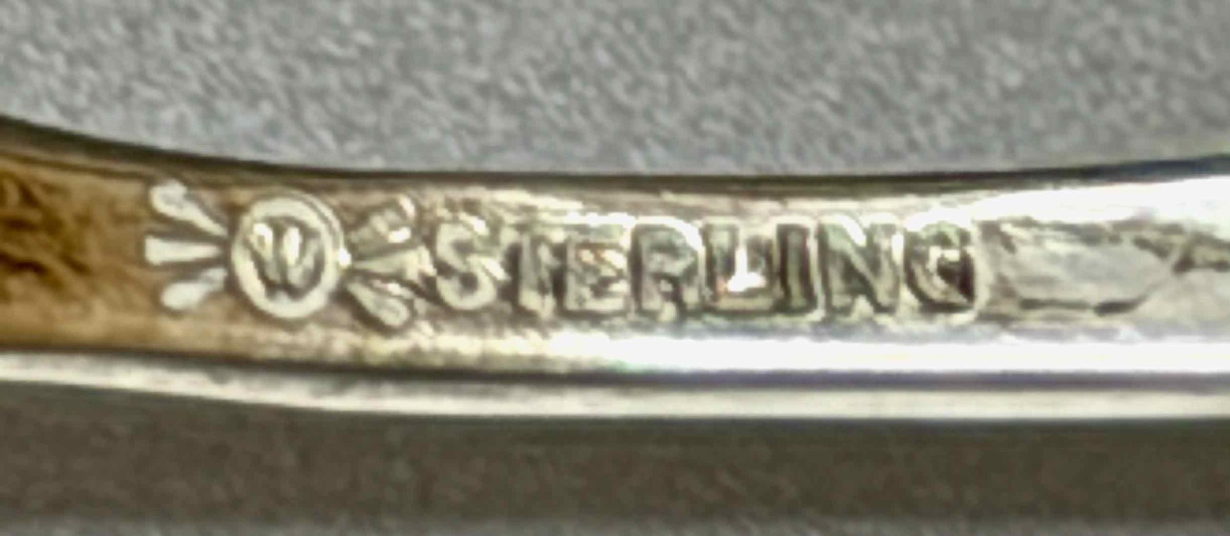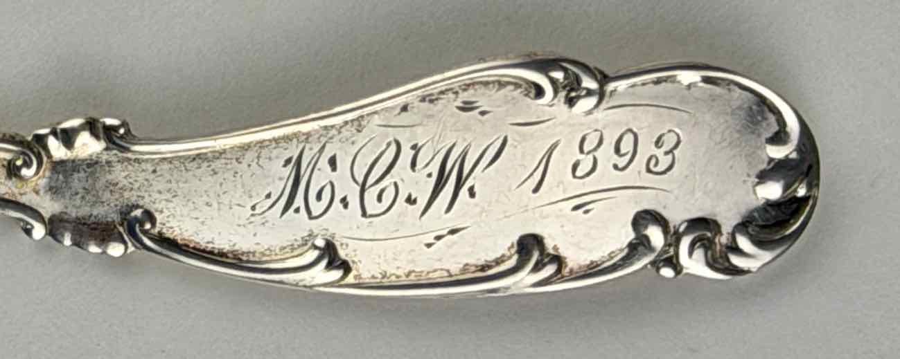 A Whiting touchmark and “STERLING” are on the underside of the handle. “M.C.W. 1893” is engraved on the underside of the handle tip.