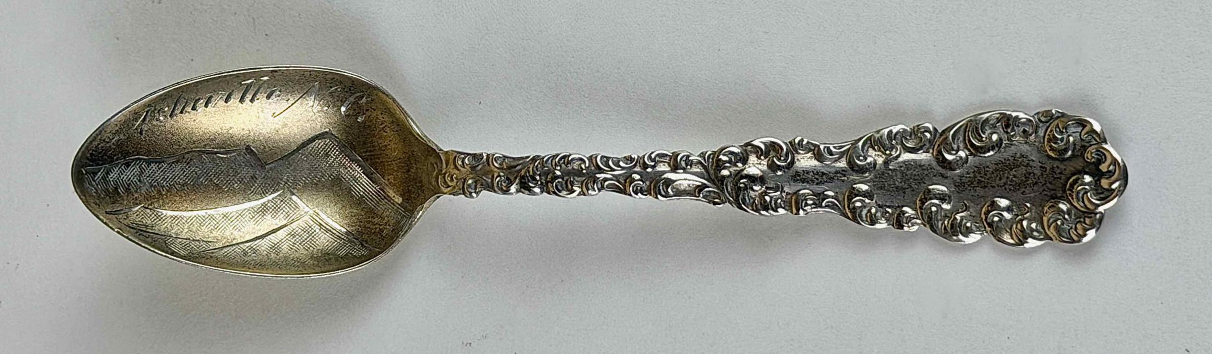 The spoon with a richly decorated foliate-scrolled handle has a relatively simple bowl with mountains executed in cross-hatching below “Asheville N.C.”