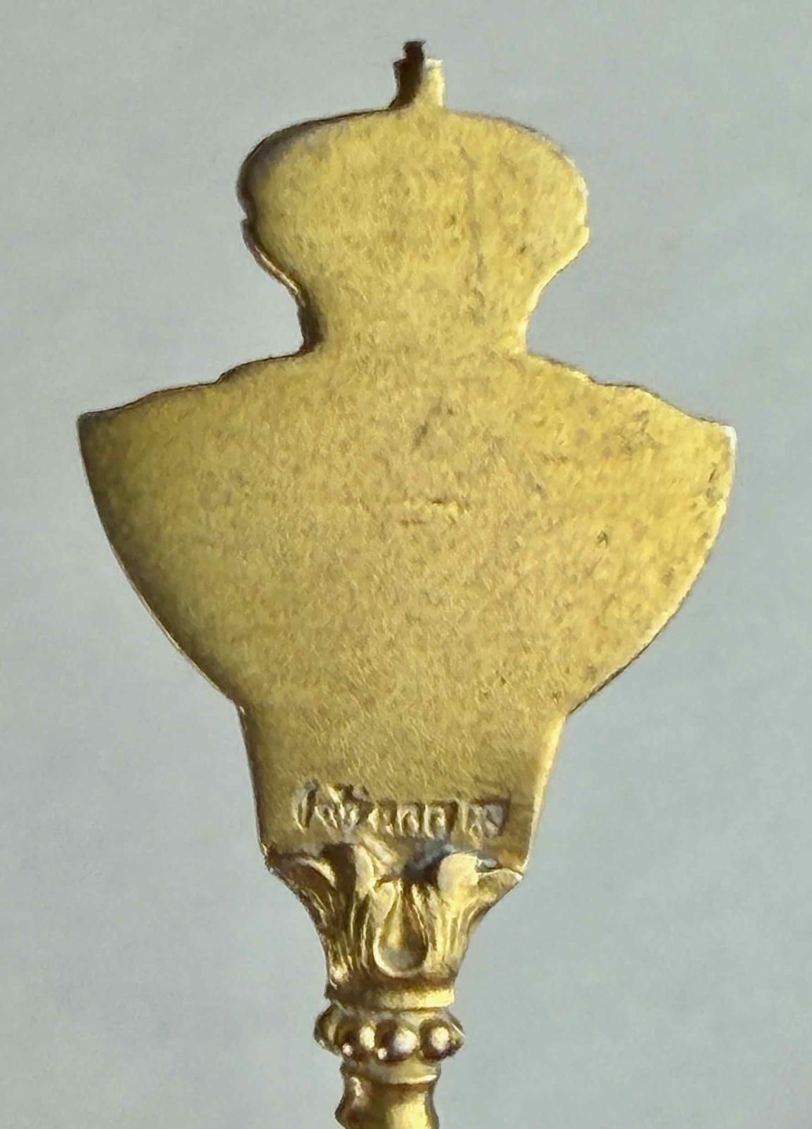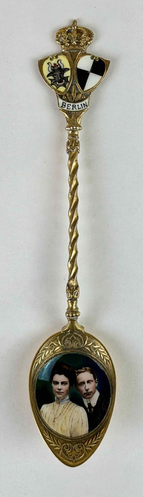 The crown and two shields on the handle tip relate to the Mecklenburg and Hohenzollern families of Germany. Although the two families had intermarried previously, they did so again in 1905 when Louise of Mecklenburg-Strelitz married Frederick William III of Prussia. They are pictured together in the bowl. This event likely occasioned the manufacture of this souvenir spoon.