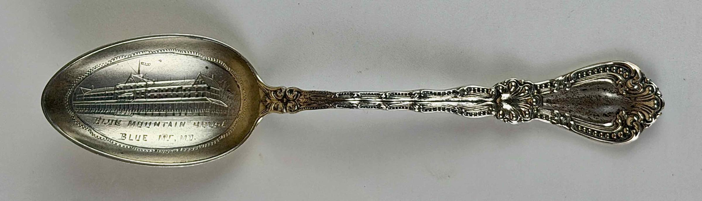 "BLUE MOUNTAIN HOUSE / BLUE MT. MD.” is across the bowl. “A” with maker touchmarks and “STERLING” with “Wm. BARTHMAN” is stamped into the back of the handle shaft.