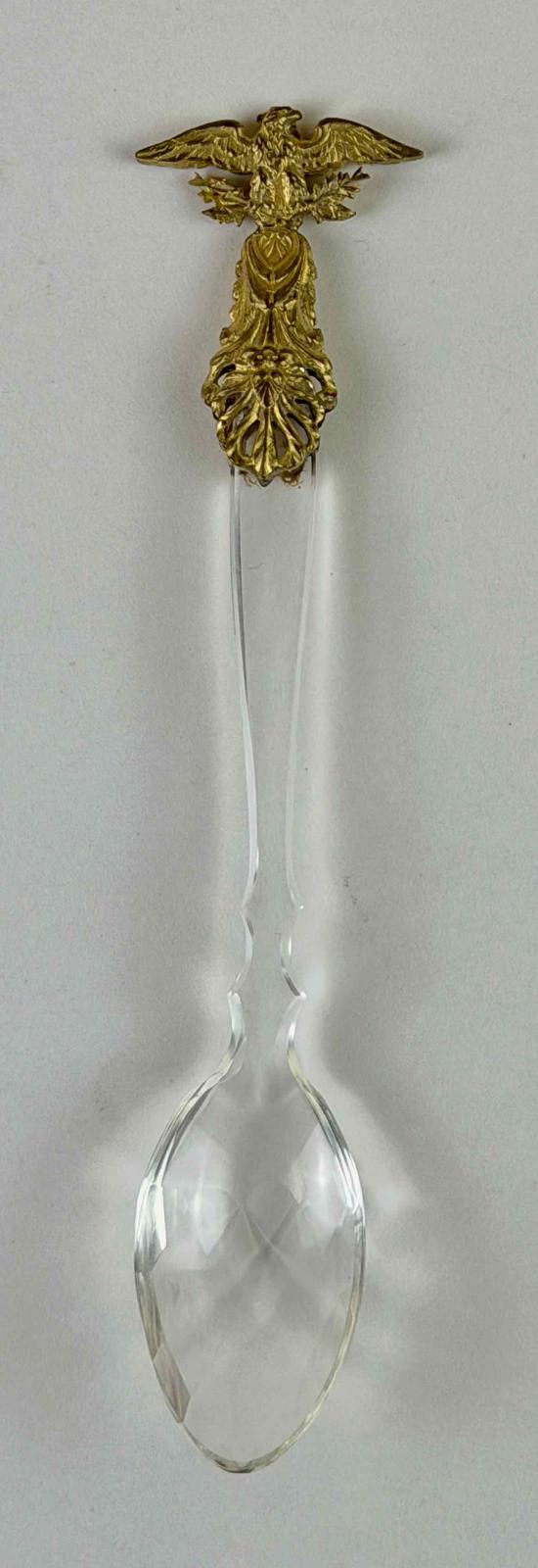 This unmarked spoon is made of cut glass with a stamped eagle attached to the tip of the handle. The eagle appears to hold arrows in one talon and laurel leaves in the other, suggesting that this symbol is of the United States, although eagles were common decorative motifs in many European countries. The base of the metal tip is a classical anthemion. The outside bottom of the bowl is cut with diamond facets.