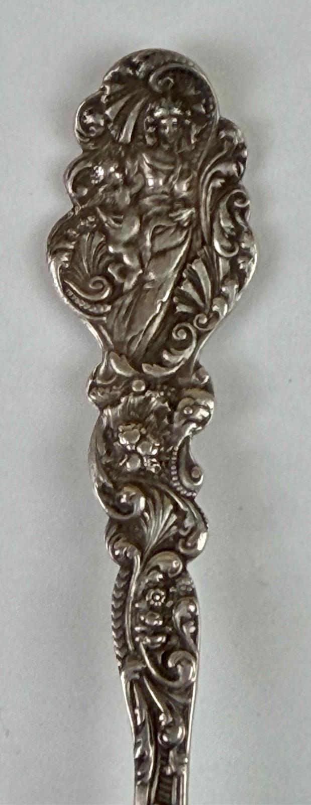 The spoon celebrates Devil's Lake in Wisconsin. The lake name is in the bowl. The handle design, which shows a young maiden on the face and is ornately rendered on the back, seems to bear no relationship to Devil's Lake. The 1888 patent date recorded on the back of the bowl is likely for the handle design. Devil's Lake State Park was established in 1911, which seems to be an appropriate time to issue a celebratory spoon as a souvenir.