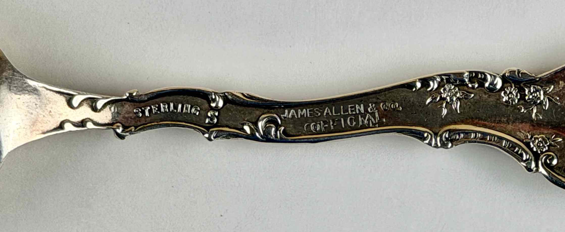 The underside of the handle is stamped James Allen & Co., which seems to stand for James Allan & Co. The misspelled name suggests that the spoon might have been made by another silver manufacturer for the Allan company.