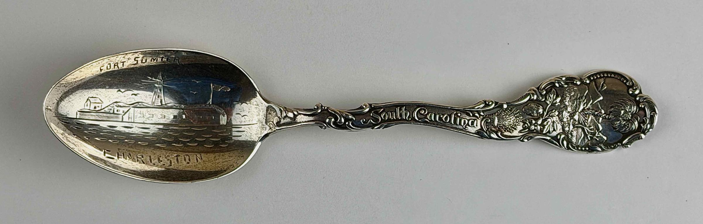 The cast spoon has a wavy handle richly decorated with imagery suggestive of South Caroline, including a palm tree, cotton balls, and a rice plant. The bowl has an image of Fort Sumter.
