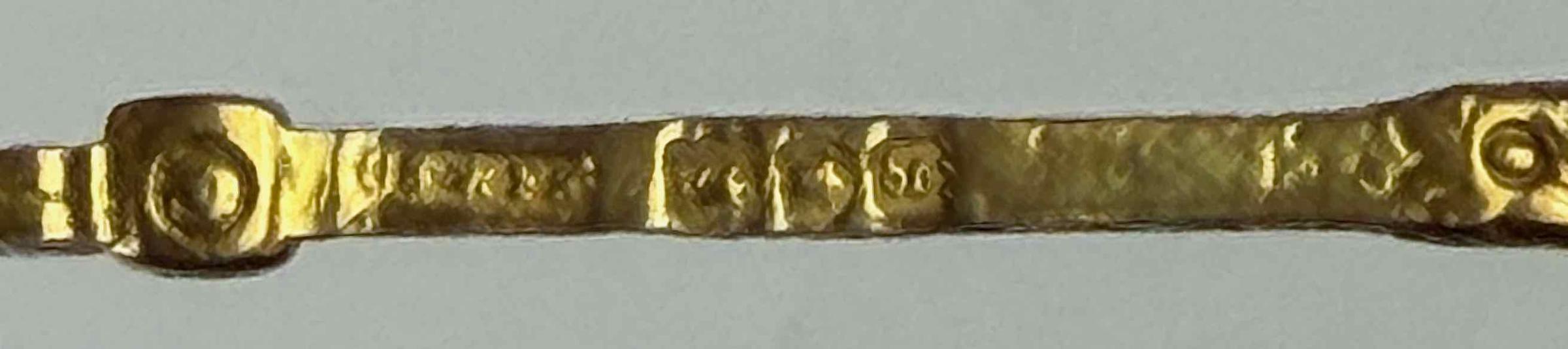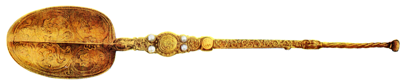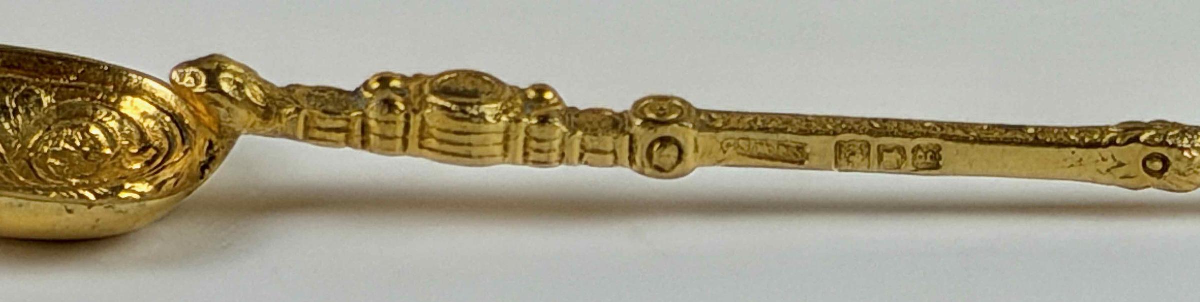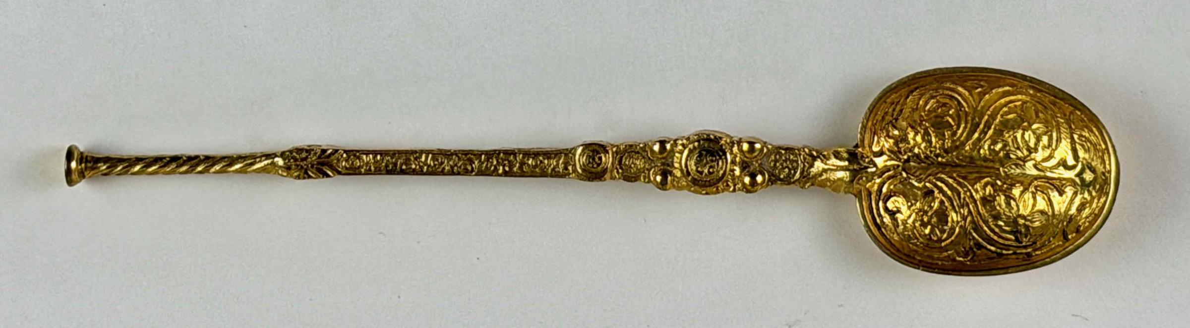 This solid gold spoon bears a Birmingham maker's touchmark, assay marks, and a date letter for 1906. The spoon itself reproduces the shape and decoration of the so-called Coronation Spoon, used to anoint English, and later British, sovereigns during a coronation ceremony. That spoon predates 1349, when it was first recorded. It is held in the Tower of London.