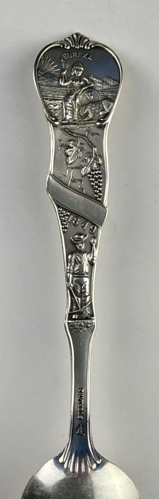On the back of the handle, a figure of Minerva, adapted from the state seal, is below “EUREKA” and above “1849” that evoke the gold rush. Below, a gold miner stands with a pick ax.