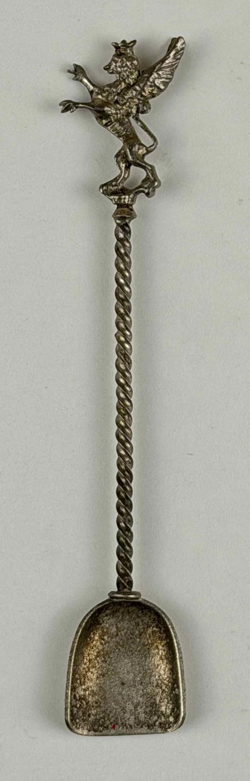 The spoon has a long and slender double-twist shaft. The "bowl" is a shovel with a flat bottom and rounded heel or shoulder. A three-dimensionally modeled griffin rearing on its hind feet caps the handle shank.