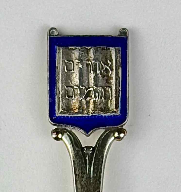 The only "souvenir"-like decoration on this spoon appears at the handle tip. It has a square panel with an outlining band in deep blue that encloses what appear to be Hebrew letters referencing "Light and Life" or "Light of Life." The lower half of the handle has been modeled to suggest it has been twisted, although the back of the handle, where it was marked by the maker and retailer, is flat.