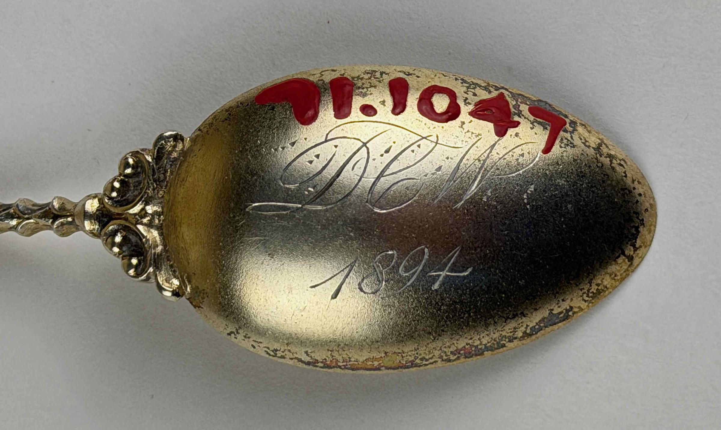 This spoon bears the engraved initials of Mary Warner's eldest son, Daniel Corbit Warner (1878-1895), who would have 16 in 1894, the date that appears underneath the initials. No evidence uncovered to date indicates the circumstances surrounding the addition of the initials and date.