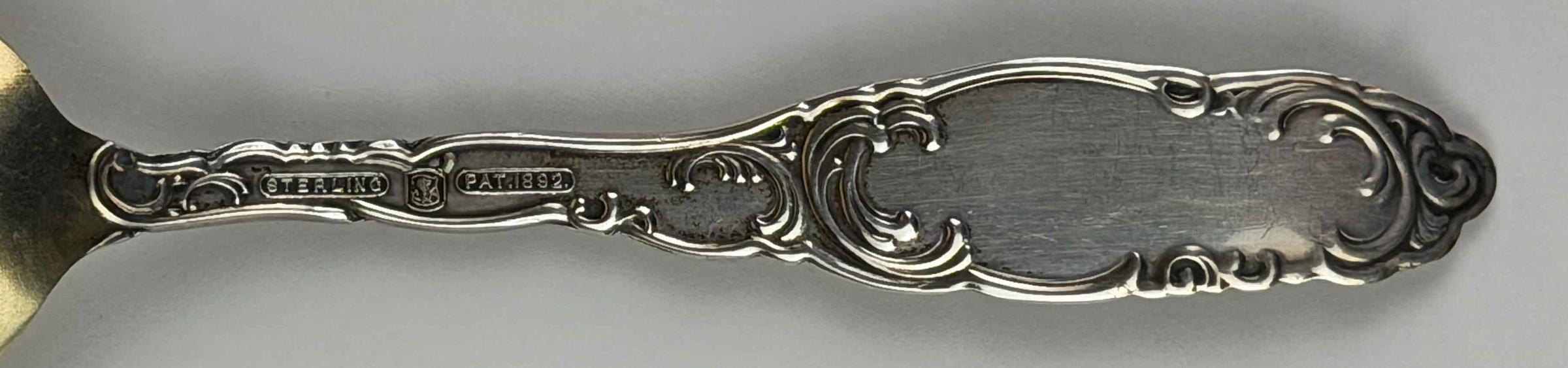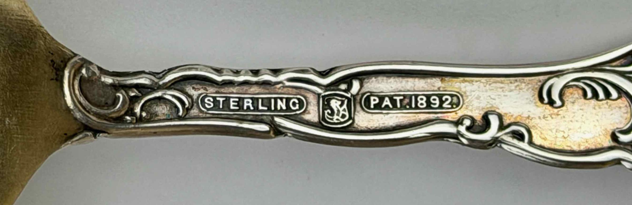 On the back of the handle, "STERLING" and "PAT.1892." are separated by the lion-like touchmark of Towle Manufacturing Co.