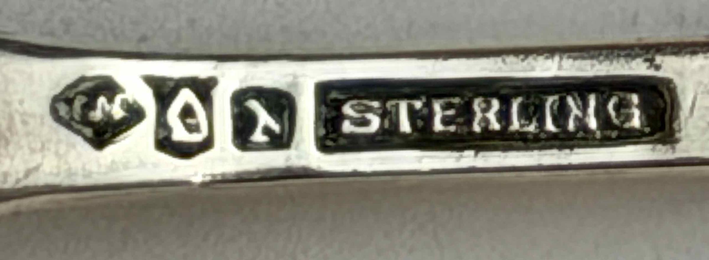 “OLD MILL / 1746” and “NANTUCKET” are on the handle. "CMR" in a diamond along with two other Robbins touchmarks and “STERLING” are on the back of the handle.